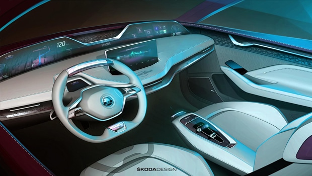 S konceptualnim vozilom VISION E marka ŠKODA čini velik iskorak u smjeru digitalne budućnosti. Prvo konceptualno vozilo sa potpuno električnim pogonom i mogućnošću automatizirane vožnje u povijesti tvrtke odlikuje se sasvim novi nivo povezivosti. Uz ekran u kokpitu i centralni dodirni ekran, preko kojeg vozač i suvozač mogu očitavati i rukovati svim važnim funkcijama i uslugama aplikacije ŠKODA Connect, svakom putniku također na raspolaganju stoji vlastiti monitor. Dodirnom se funkcijom može rukovati brojnim komfornim značajkama kao što su zabavni sadržaji, a moguće je pozvati i podatke o vozilu.