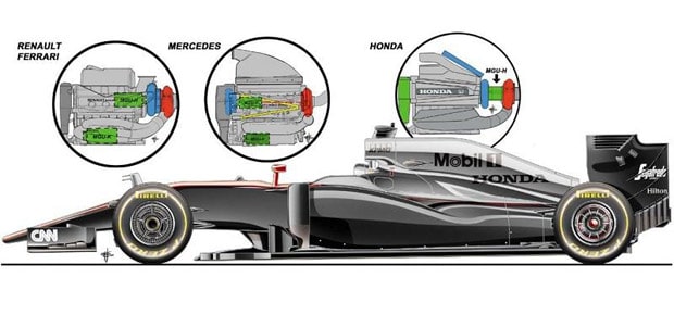 Sistemski, Mercedes je postigao pun pogodak razdvajanjem kompresorskog i turbinskog dijela, na dvije strane motora, dok su se Renault i Ferrari odlučili za kovencionalnu postavku. Druga sistemska odluka odnosi se na postavku MGU-H sistema koji toplotu pretvara u energiju, kao MGU-K koji kinetičku energiju pretvara u struju. Naime, prikupljena energija iz oba MGU sistema koristi se dijelom za pogon točkova, a dijelom za pokretanje turbine kako bi se izbjegla turbo rupa.