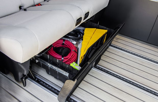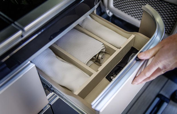 Tu su i udobni ležaji, sklopiva krovna konstrukcija i sudoper (rezervoaz za vodu zapremine 38 l i rezervoar za otpadnu vodu zapremine 40 l) i frižider (kapaciteta 40 l, -20°C) i kuhalo i garnitura sklopivih stolica… Spisak opreme ja zaista bogat i zanimljiv.