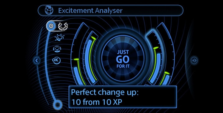 Rezultati se prikazuju preko onboard monitora, pri čemu se Experience Points (XP) dodeljuju za sportsku ali sigurnu vožnju. Driving Excitement Analyser je još jedan dodatak postojećem Driving Excitement paketu i uključen je kao takav u MINI Connected App update.