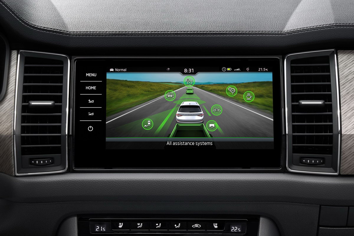 Unutrašnjosti novog KODIAQ-a podignuta je noa novi nivo. Pored novih ukrasnih traka, u KODIAQ su sada uključeni i dodatni kontrastni šavovi na armaturnoj ploči i oblogama vrata. Ventilirana ergonomska sjedišta, uključujući funkciju masaže, dostupna su kao opcija za vozača i suvozača. Prvi put je ŠKODA KODIAQ dostupan s izborom električno podesivih ergonomskih sjedišta. Ona opciono mogu biti grijana i kožom presvučena, a tu je funkcija masaže.
