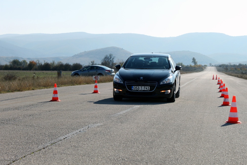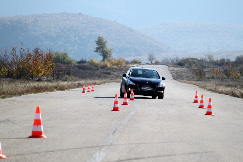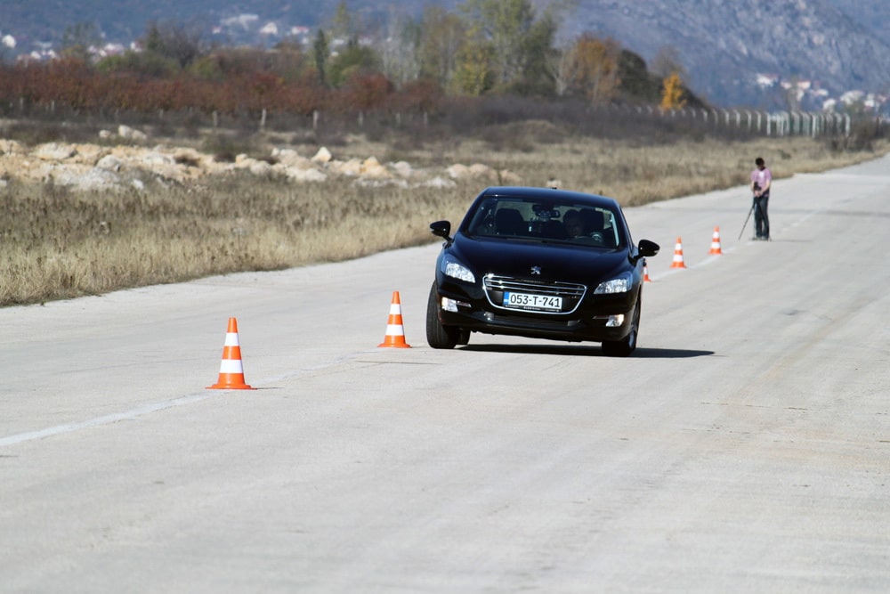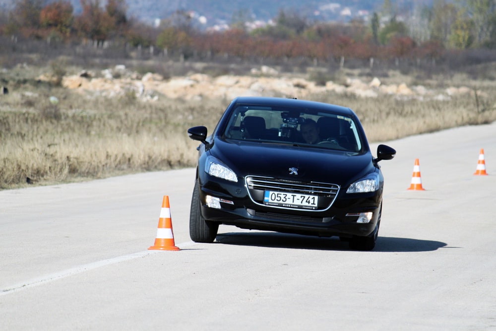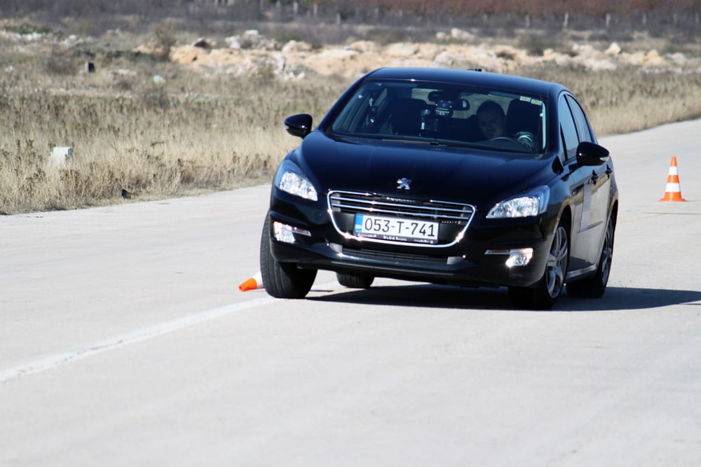 Najveća vrijednost bočnog ubrzanja pri slalom-testu prelazila je 9 m/s2, dok je istovremeno najveća vrijednost ugla zanošenja iznosila svega 3o. Test nagle izmjene pravca kretanje, odnosno los-test, takođe sa 4 osobe u vozilu, Peugeot 508 je savlađivao prolazeći prosječnom brzinom 101,2 km/h uz blago zanošenje zadnjeg dijela u posljednjoj sekciji testa, koje se vrlo lako koriguje. Vrijednosti bočnog ubrzanja i ugla zanošenja su skoro identične kao i na slalom testu. U slučaju posljednjeg poligonskog testa kojeg smo obavljali, a to je kočenje s preprekom, 508-ica je opet prikazala odlične rezultate: uspješno obavljen test sa početne brzine od čak 93 km/h, pri čemu su vrijednosti bočnog ubrzanja iznosile 8 m/s2 uz istovremeno usporenje od skoro 10 m/s2 (1 G). Iako je vozilo prilikom ovog testa na trenutke bilo u kontaktu sa podlogom samo sa 3 točka, niti jednom se nije stekao osjećaj gubitka upravljivosti i kontrole uopšte.