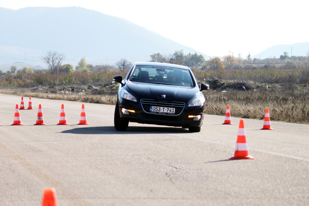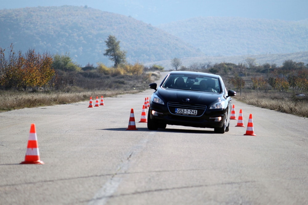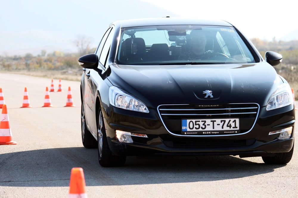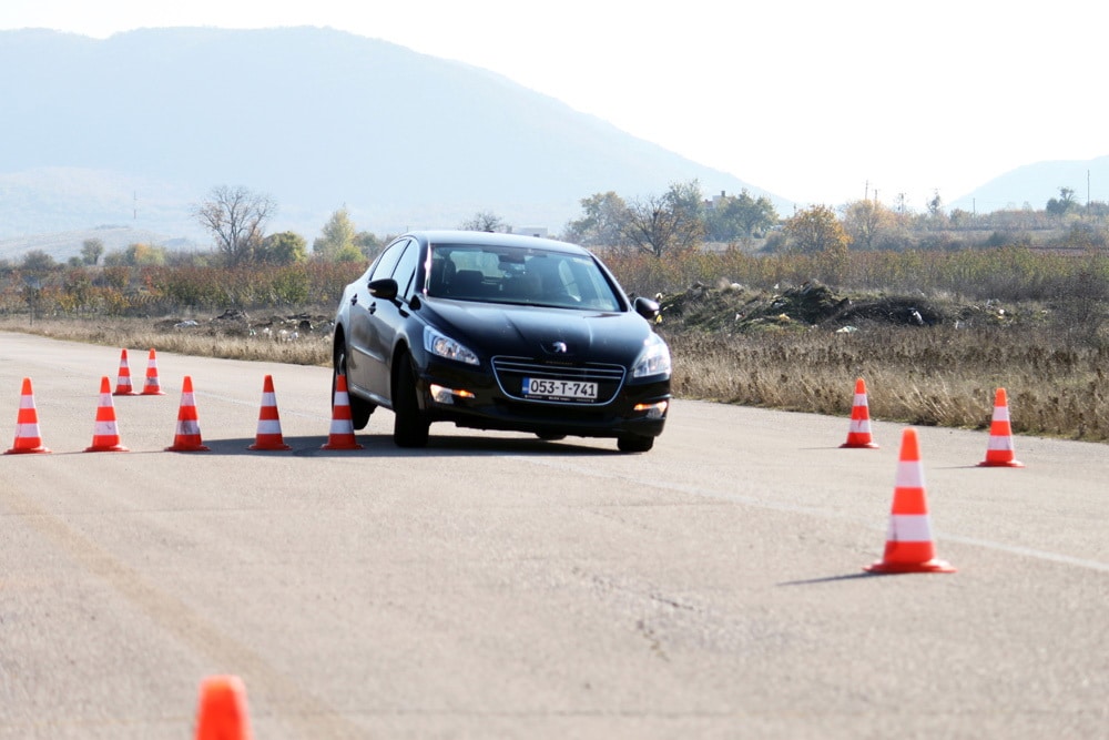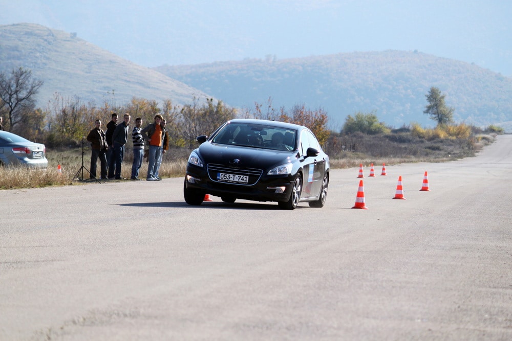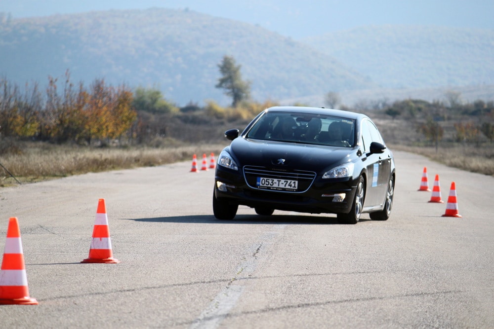 Najveća vrijednost bočnog ubrzanja pri slalom-testu prelazila je 9 m/s2, dok je istovremeno najveća vrijednost ugla zanošenja iznosila svega 3o. Test nagle izmjene pravca kretanje, odnosno los-test, takođe sa 4 osobe u vozilu, Peugeot 508 je savlađivao prolazeći prosječnom brzinom 101,2 km/h uz blago zanošenje zadnjeg dijela u posljednjoj sekciji testa, koje se vrlo lako koriguje. Vrijednosti bočnog ubrzanja i ugla zanošenja su skoro identične kao i na slalom testu. U slučaju posljednjeg poligonskog testa kojeg smo obavljali, a to je kočenje s preprekom, 508-ica je opet prikazala odlične rezultate: uspješno obavljen test sa početne brzine od čak 93 km/h, pri čemu su vrijednosti bočnog ubrzanja iznosile 8 m/s2 uz istovremeno usporenje od skoro 10 m/s2 (1 G). Iako je vozilo prilikom ovog testa na trenutke bilo u kontaktu sa podlogom samo sa 3 točka, niti jednom se nije stekao osjećaj gubitka upravljivosti i kontrole uopšte.