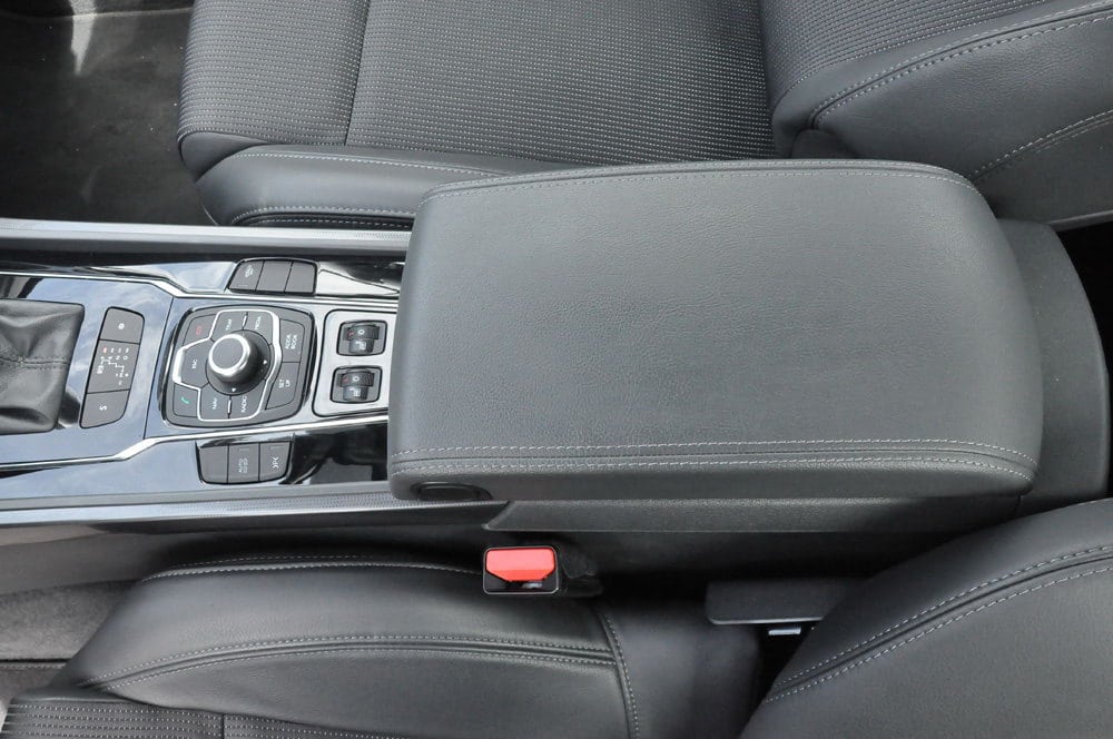 Dio konzole oko tipki multimedijalnog sistema krasi crni lakirani plastični implantat, koji je vrlo otporan. Isto rješenje primjenjeno je i na centralni dio između ručice mjenjača i srednjeg naslona za ruku sa dodatkom hromiranog okvira. U svemu ovome pronašli smo nekoliko zamjerki, prva se odnosi na nedostatak pretinca oko ručice mjenjača pogodnog za odlaganje mobilnog uređaja ili ključa automobila (automobil posjeduje „pametni ključ“) i druga zamjerka na bočno otvaranje poklopca pretinca srednjeg naslona za ruku.