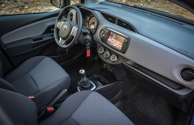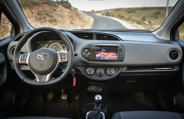 Kada prvi put sjednete u novog Yarisa sigurno ćete biti iznenađeni. Centralna ploča izrađena je u dvije boje i napravljena je od obične plastike. Kod prethodnog modela (2011.) plastika centralne konzole bila je obogaćena gravurom koja je vrhunske izrade što ju je činilo mnogo ljepšom za oko. Ipak, ta gravura plastike je promjenjena, pa je sada gotvo ravna, a takav potez i nije za pohvalu jer je prethodna zaista bila “cool”. Većinu kabine prekriva crna plastika koja je u istoj gravuri kao i centralna ploča. Finalna obrada svih plastičnih dijelova je odlična tako da se teško može naći krupna zamjerka.