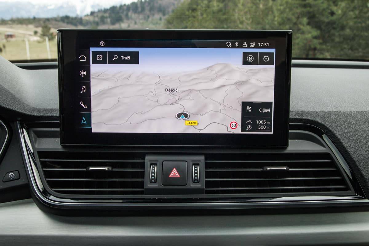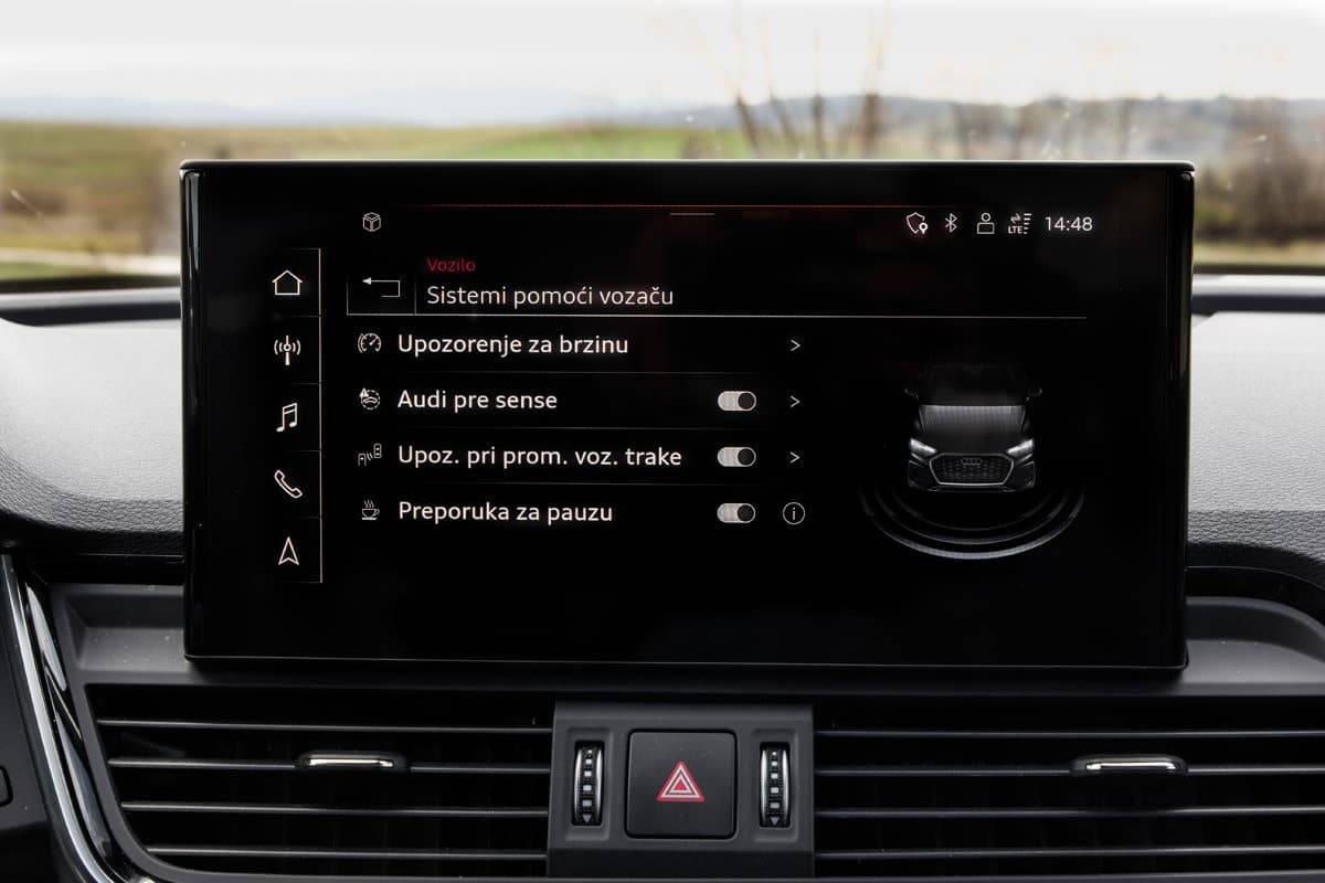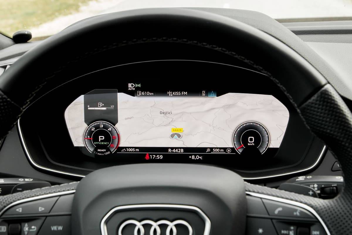 Ispred vozača je digitalna instrument ploča dijagonalne veličine 12,3 inča koja nudi mogućnost personalizacije prikaza i to opet bez mogućnosti nepotrebnog igranja. Jednostavnim pritiskom na jednu od tipki volana mijenjate već fabrički kreirani prikaz, pa tako možete izabrati analognu interpretaciju kazaljki ili preko cijelog ekrana kartu navigacionog sistema. U svakom slučaju jednostavan prikaz, jednostavna grafika, ali sa svim potrebnim informacijama. U istoj ravni nalazi se i centralni ekran MMI sistema (10,1 inč dijagonalne veličine) koji je osjetljiv na dodir. Veličina ekrana je optimalna i zaista ne bi bilo smisla da su njegove dimenzije veće, što je danas potpuno nerazumljiv trend – postavljanje ogromnih centralnih ekrana dok se ispred vozača postavljaju minimalistički ekrani.