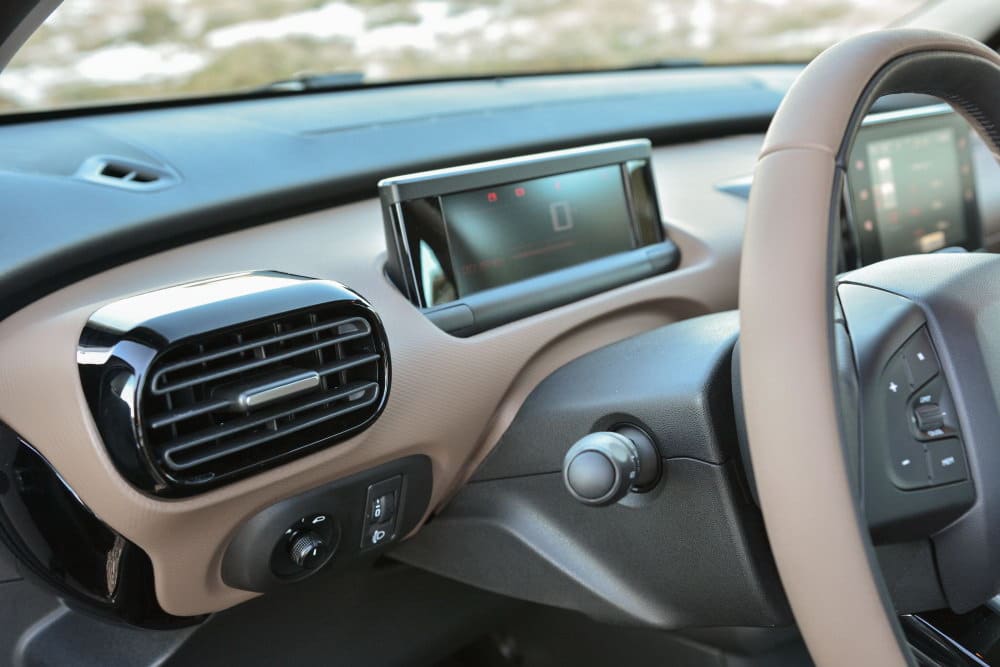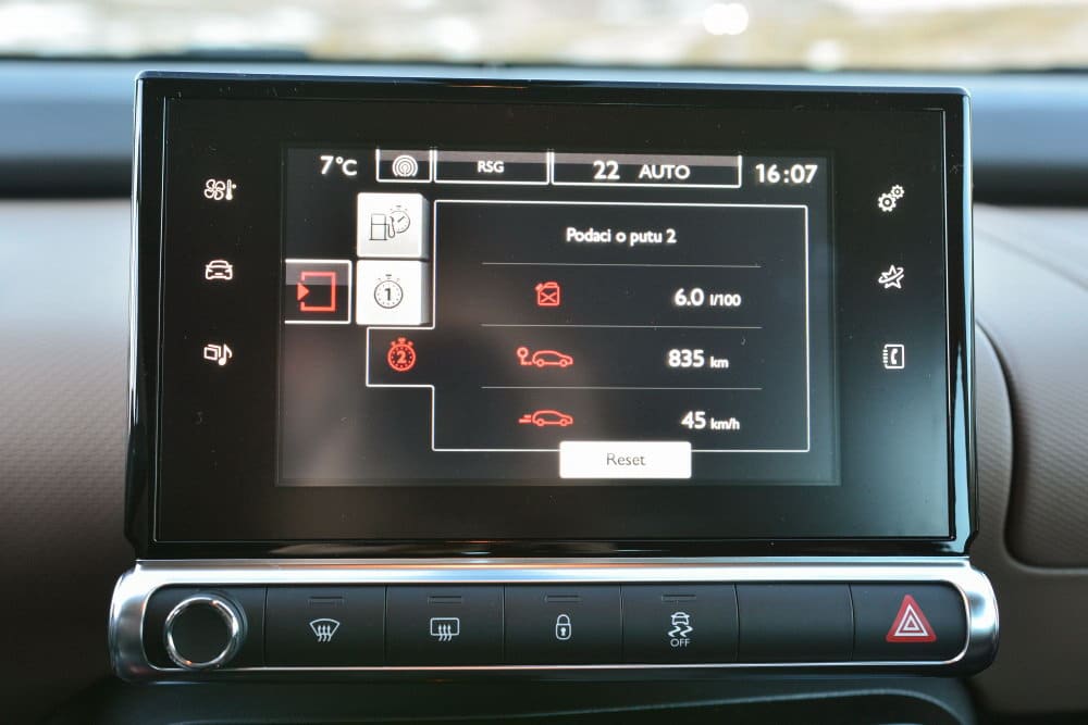 U sredini centralne konzole nalazi se 7 inčni ekran osjetljiv na dodir putem kojeg se upravlja sa ventilacijom, audio uređajem, telefonom i sl. Svi prekidači su uklonjeni sa centralne konzole i komande se izvršavaju isključivo putem ekrana osjetljivim na dodir. Nema šta, zaista tehnološki odlično izvedeno, ali ne i praktično. Zašto? Pa da bi recimo upravljali ventilacijom, morate tipkati po ekranu, a to će vam svakako skretati pažnju tokom vožnje, što i nije baš poželjno u gradskoj vožnji. To nije „problem“ samo kod ovog automobila, već kod svih koji su primjenili isti sistem. Kada je riječ o jačini kontrasta ekrana, tu nema problema, sve se jasno vidi i po najvećem suncu kada je refleksija izrazito jaka.