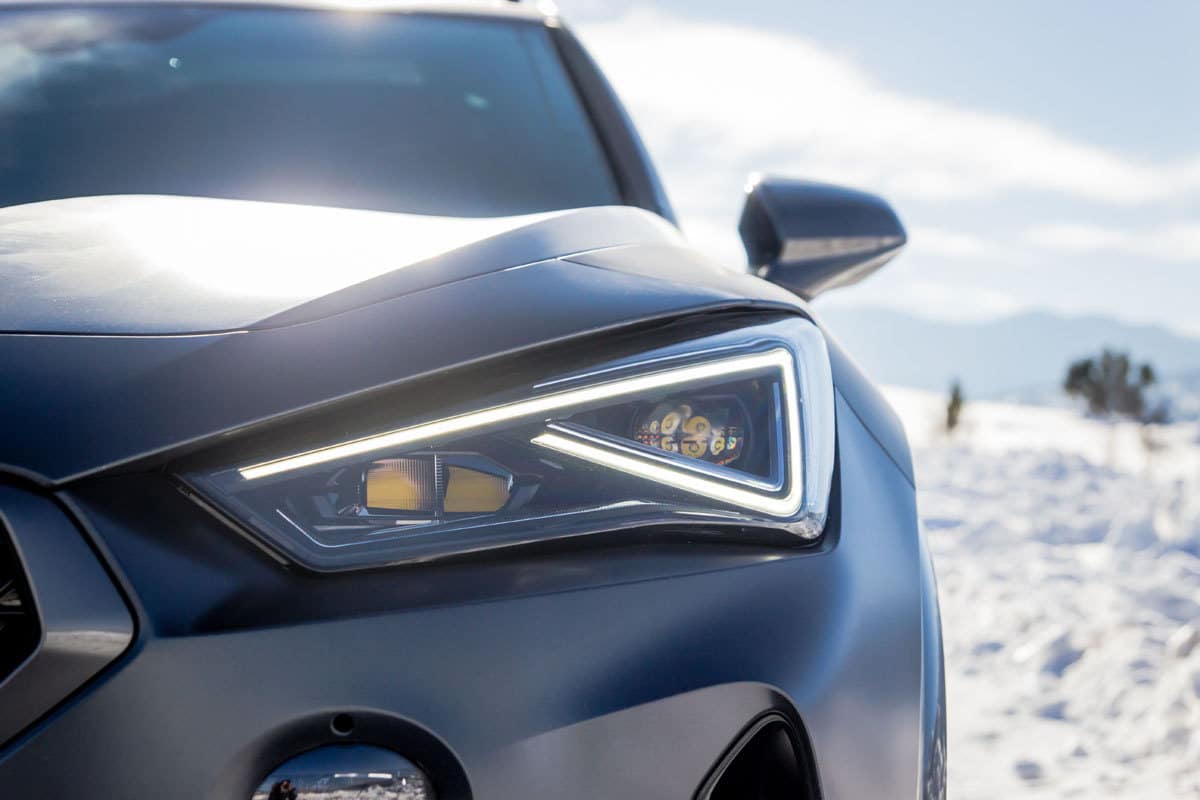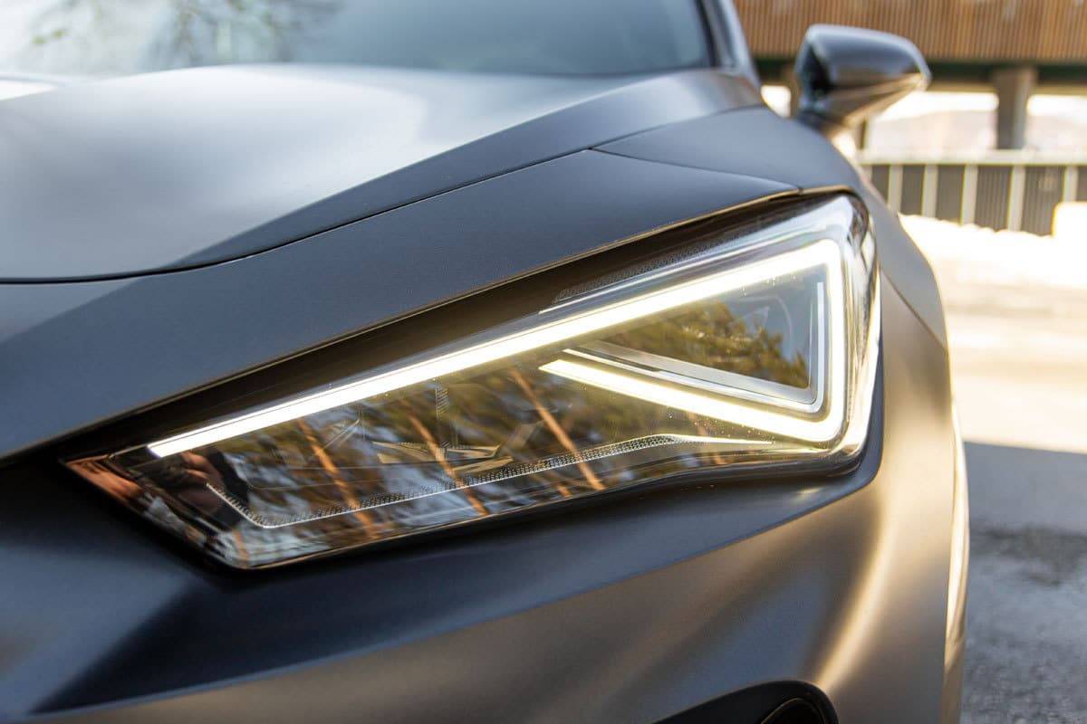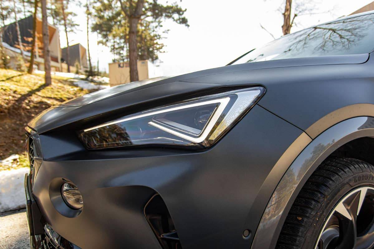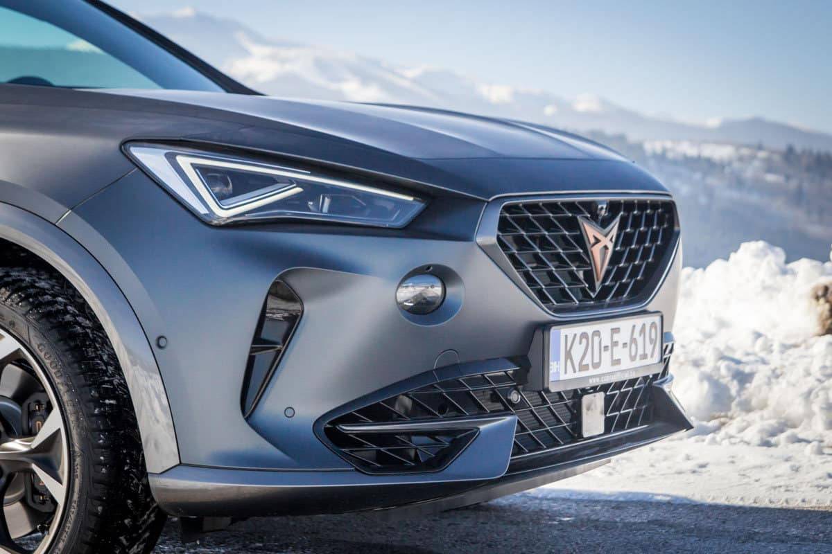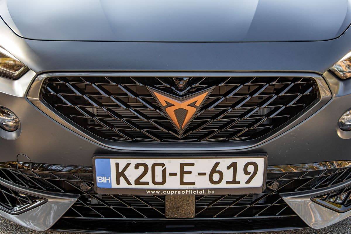 Prednjim dijelom dominiraju markanta LED Matrix svjetla između kojih se nalazi robusna rešetka motora obojena visoko sjajnom crnom bojom. Na njenoj sredini nalazi se velik CUPRA logo u bakarnoj boji što je posebno estetski efektan detalj. Da nije sve u estetici govore i aerodinamički otvori u samim krajevima odbojnika koji preusmjeravaju strujanje zraka sa prednjeg dijela na bočne dijelove automobila.