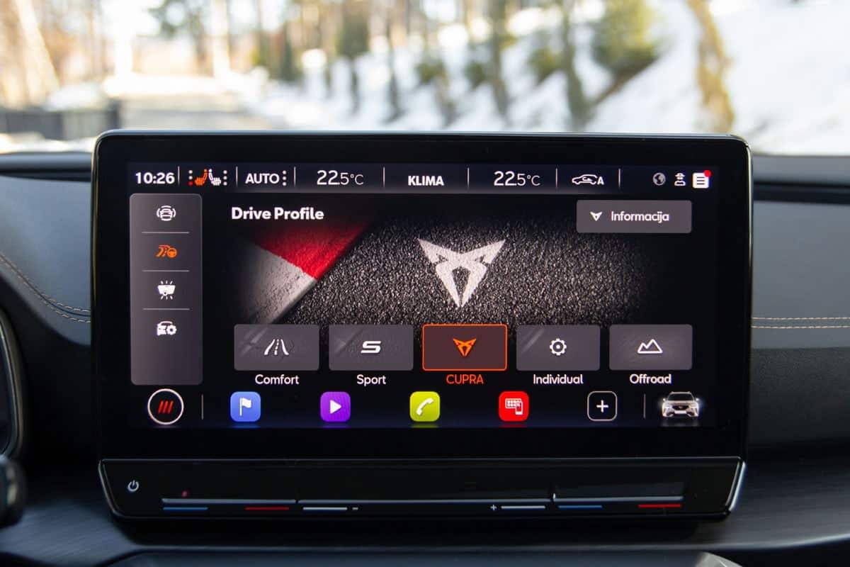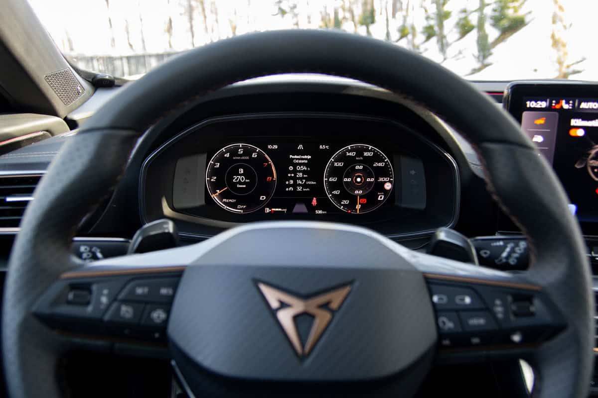 Nakon što sjednete u “CUP Bucket” sportska sjedišta (koja imaju mogućnost postavljanja i pravih sportskih pojasa za vezivanje) i podesite poziciju sjedenja slijede dva neizostavna koraka: pritisak na prekidač Start Engine i odabir CUPRA režima vožnje. Ovaj fabrički kreiran režim vožnje isporučuje vam ono najbolje što može ovaj automobil.