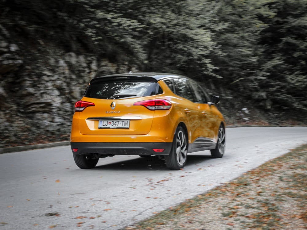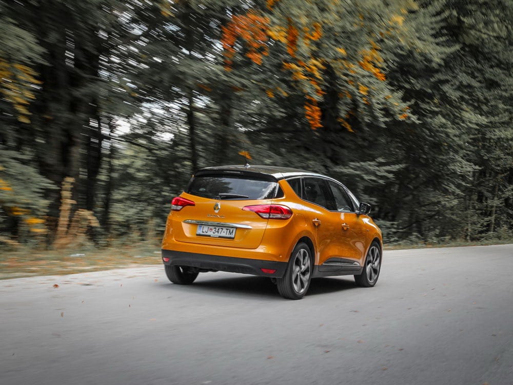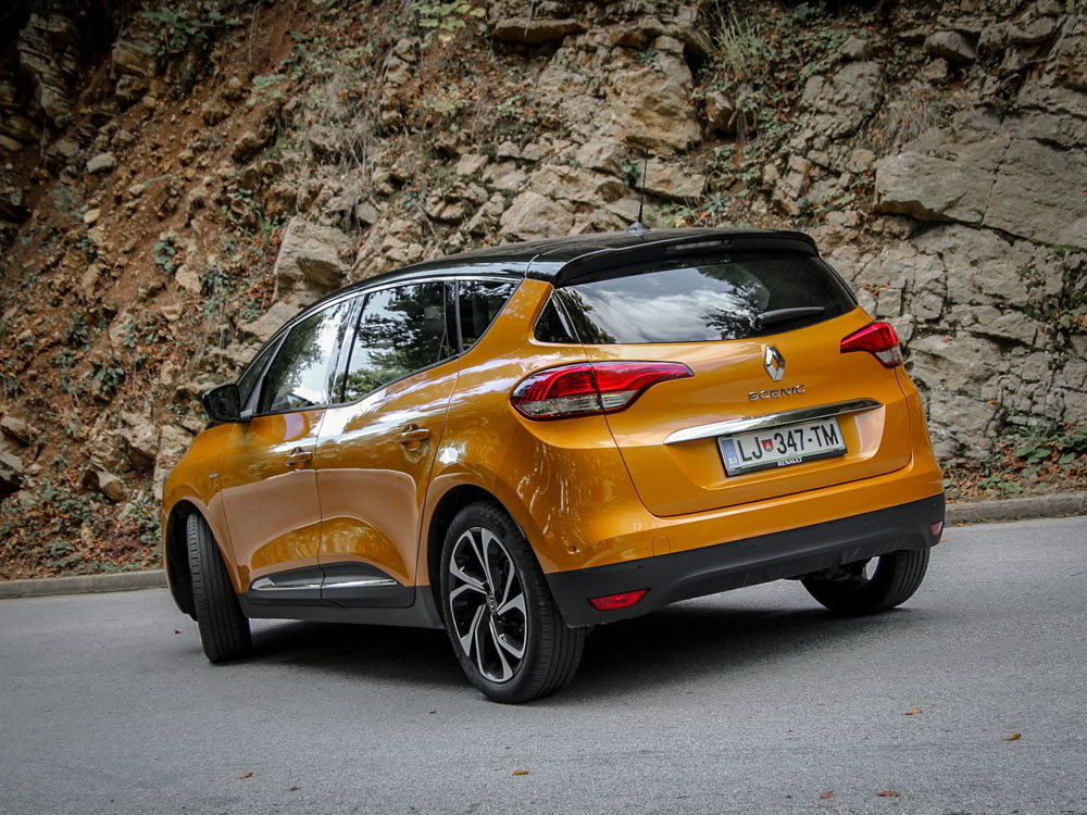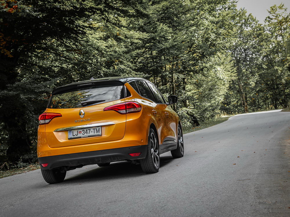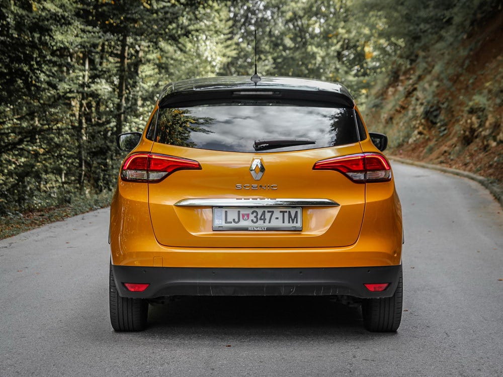 Zadnjim dijelom automobila dominira veliki poklopac prtljažnika i vodoravno izdužena svjetlosna grupa koja je također dostupna u LED tehnologiji. Ukupno gledano, dizajn novog Scénica je vrlo primamljiv, posebno kada je karoserija obojena u dvobojnu kombinaciju kao testni model. Medeno žuta boja karoserije sa zvjezdano crnim krovom odlična je kombinacija koja vam osigurava da nećete ostati ne primijećeni.