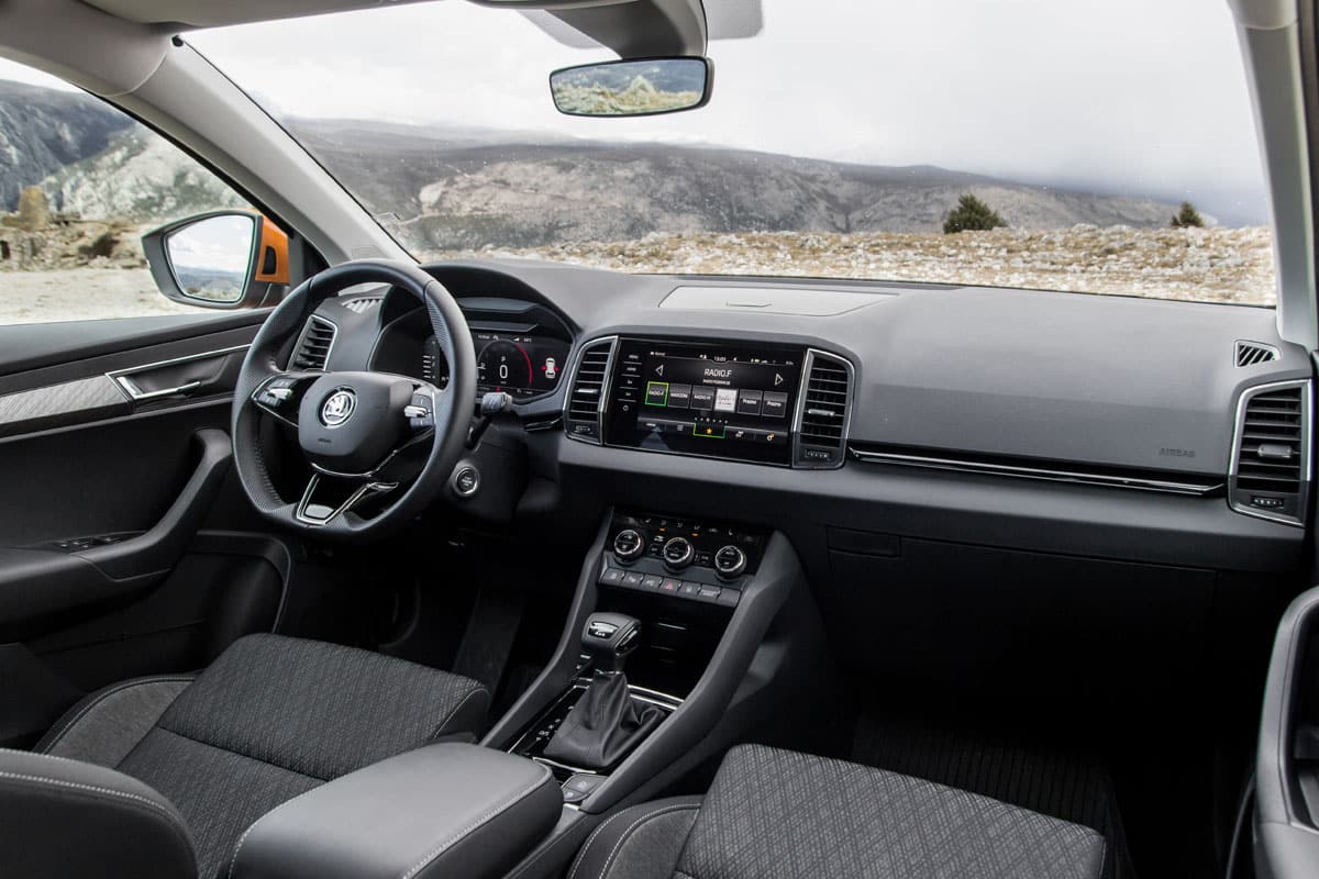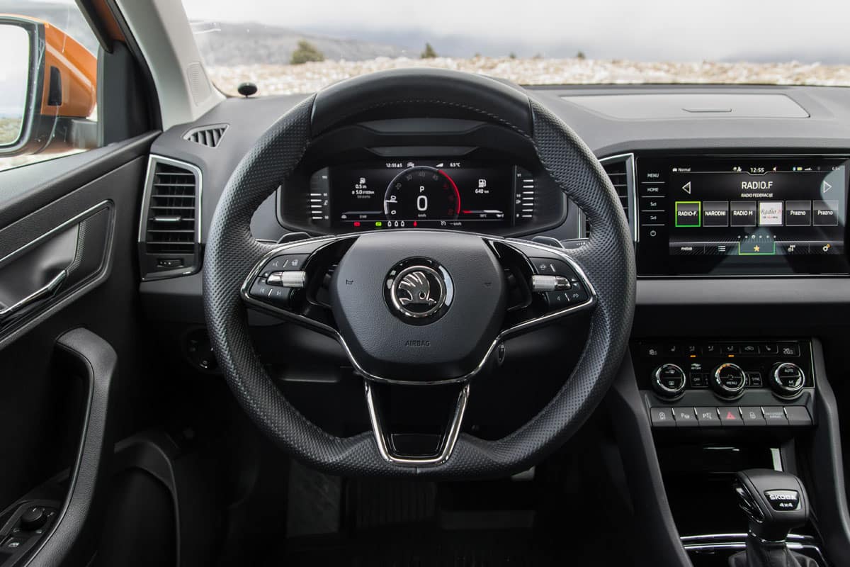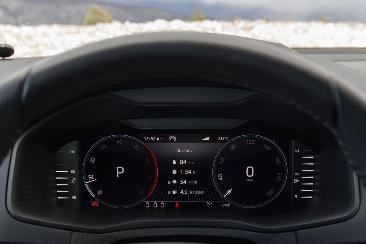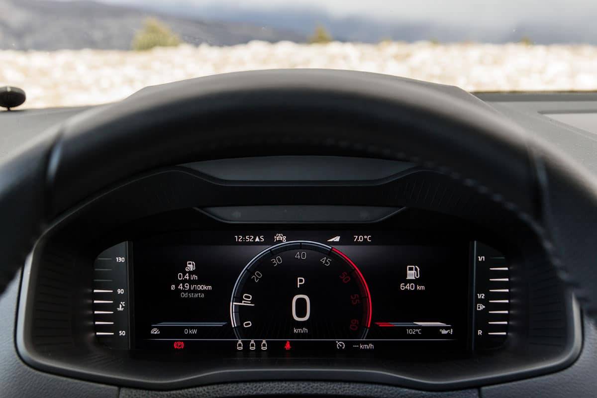 ŠKODA je u KAROQ modelu zadržala još uvijek najbolji omjer digitialnih i analognih rješenja pa tako ispred vozača imamo standardni (8 inčni) kombinovani digitalni instrument (Virtual Cockpit). Testni model bio je opremljen opcionim većim Vrtual Cockpitom čija dijagonalna dužina ekrana je 10,25 inča i nudi mogućnost promjene grafičkog okruženja. Shodno izboru grafičkog okruženja različit je broj prikazanih informacija, pa tako svaki vozač može pronaći ono što mu odgovara i što mu je potrebno tokom vožnje.