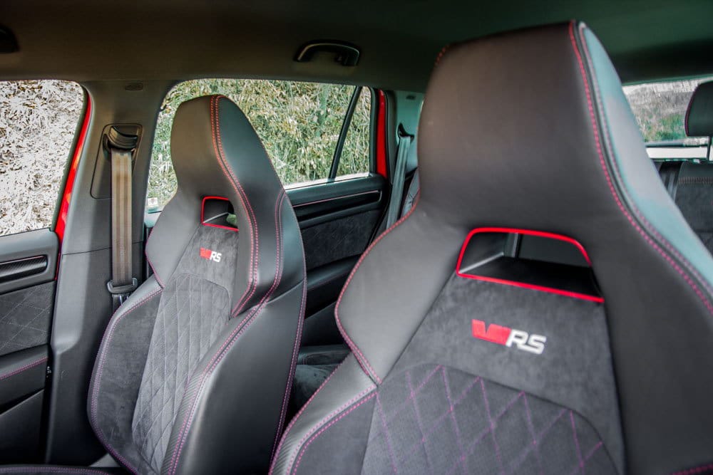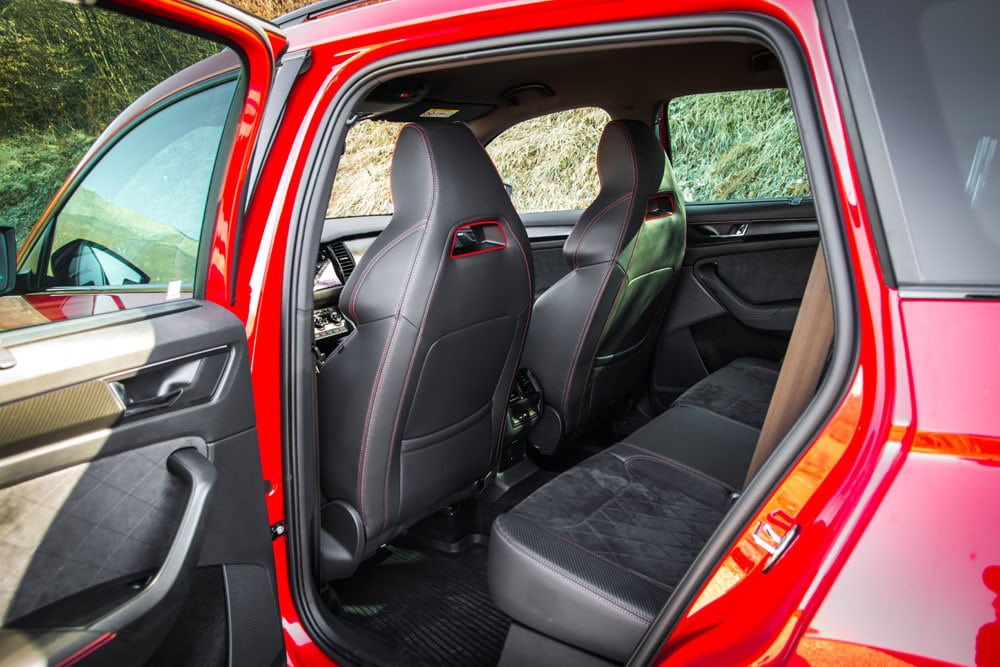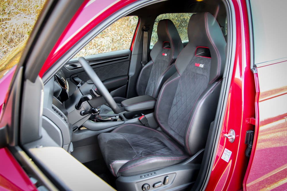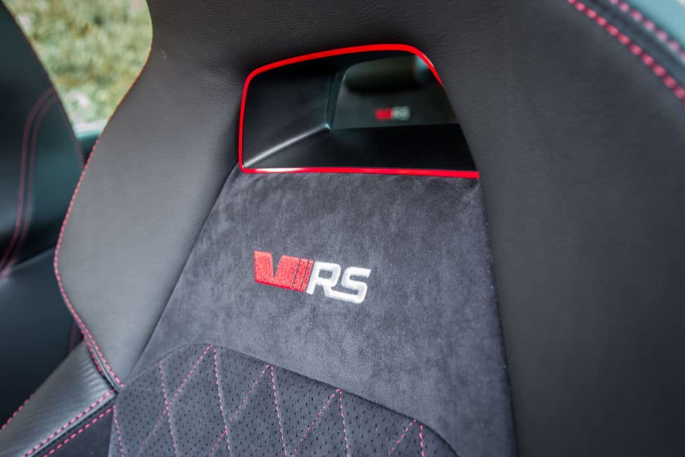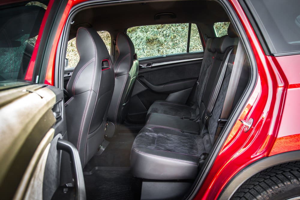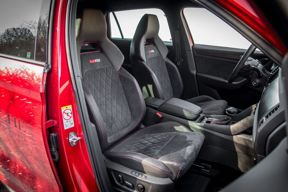 Sportska sjedišta ili bolje rečeno „kadice” u kojima sjedite presvučena su u kombinaciji kože i alkantare dok su šavovi prošiveni kontrastnim crvenim koncem. Na njihovim jednodijelnim naslonjačima izvezena je neizostavna oznaka vRS. Kodiaq vRS standardno je opremljen sa pet sjedišta, dok je u opciji ponuđen treći red sa dva sjedišta koja onda zauzimaju dio prtljažnika.