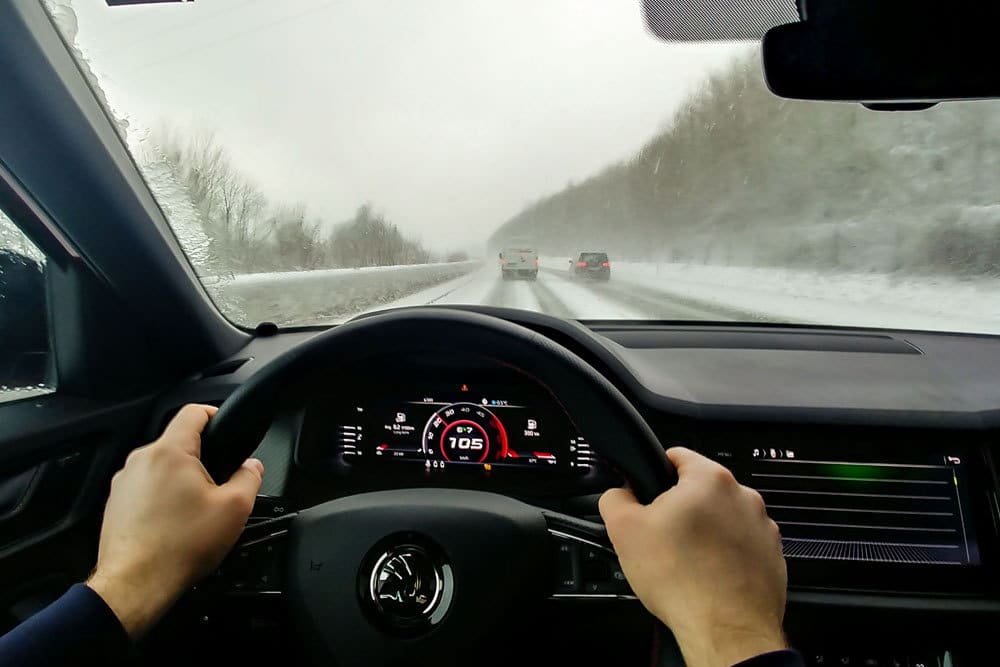 KODIAQ vRS ima elektronski prilagodljivi ovjes i direktan upravljač pa se automobil u vožnji ponaša poput manjeg kompaktnog modela. Tokom putovanja imali smo priliku voziti po snježnoj oluji gdje je autoput bio prekriven sa dosta snijega i leda. U takvoj situaciji KODIAQ vRS se pokazao kao veoma upravljiv i stabilan automobil, bez obzira na pozamašnu težinu i velike točkove.