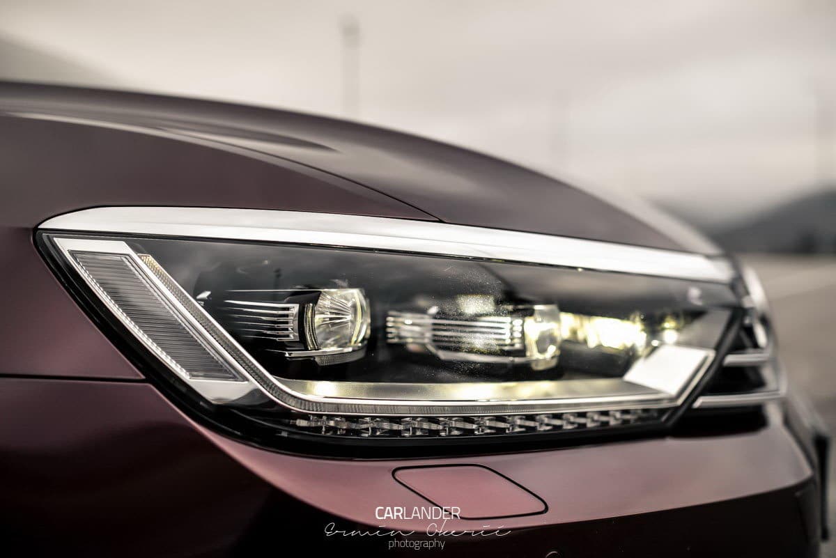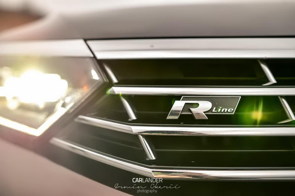Hromirani detalji na branicima i okvirima stakala savršeno su ukomponovani sa osjetno zatamnjenim staklima. Testirani model imao je opciono doplativa „full LED“ prednja svjetla sa funkcijom praćenja ugla zakreta volana, dok je bi-xenon sa dnevnim LED svjetlima standard za sve Passat R Line modele.