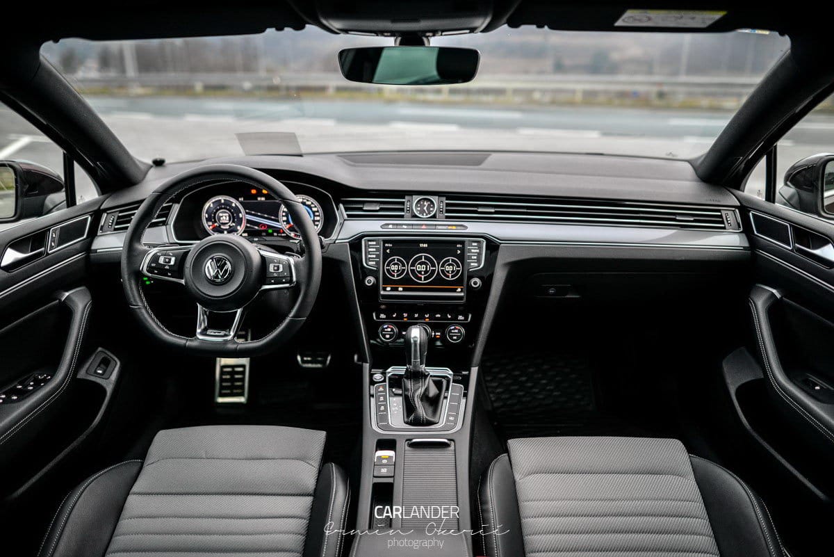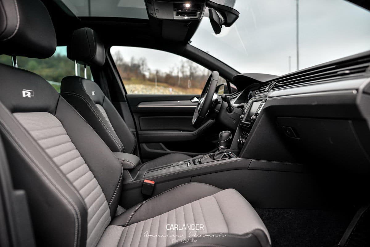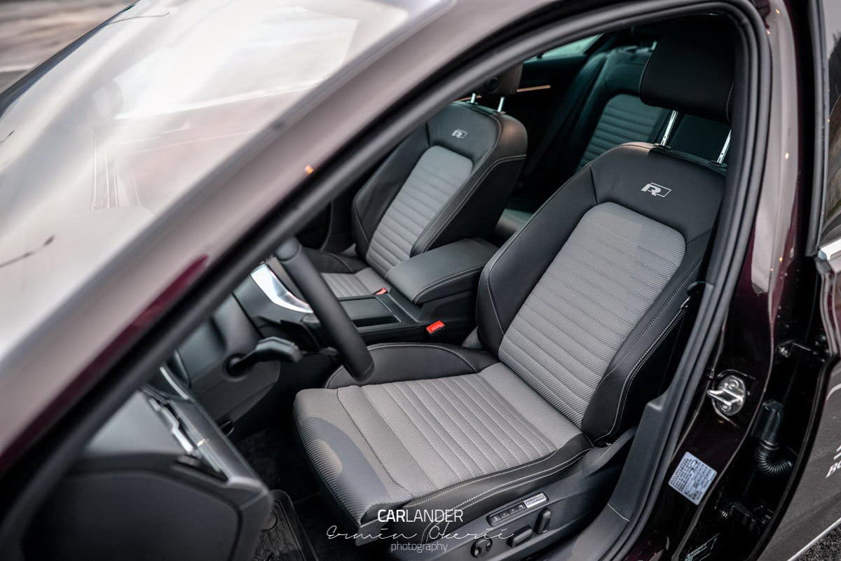 Unutrašnjost Passata R Line jasno je prepoznatljiva, već pri ulasku u automobil na naslonima prednjih sjedišta istaknuta je oznaka „R“, a sjedišta pružaju odličan komfor i bočnu potporu. Treba istaći da je testni model imao ergoComfort sjedište elektro podesivo u 14 pozicija, sa masažerom na vozačevoj strani. Također, vozačevo sjedište imalo je podršku u bedrenom području i mogućnost memorisanja pozicije, te komfornu funkciju za ulaz/izlaz iz vozila čime se olakšava ulazak i izlazak iz automobila (sjedište se samo pomjera naprijed/nazad pri ulasku i izlasku iz automobila).