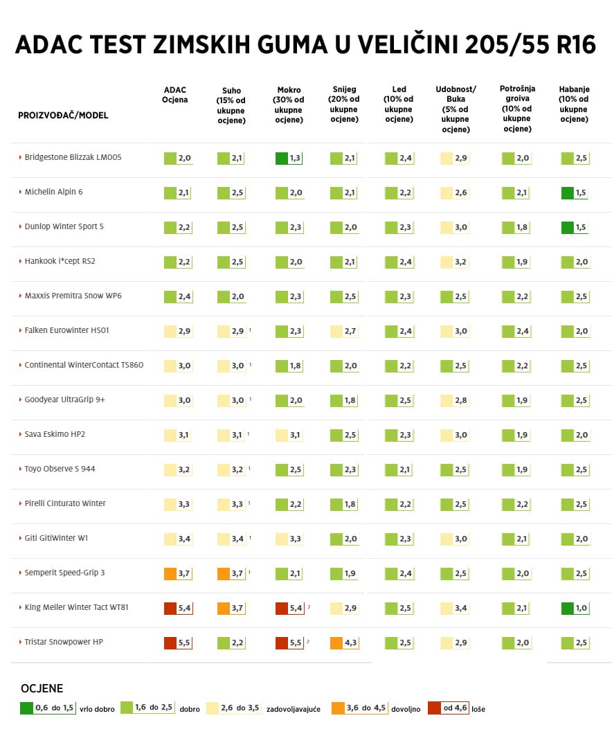 Ukupni rezultat za veličinu 205/55 R16 H (do 210 km/h) u cjelini je pozitivan: od 15 testiranih modela, dvanaest guma svoj posao obavljaju dobro. Samo je jedan model dobio dovoljnu ocjenu, a dva modela su degradirana zbog lošeg prianjanja na mokrom.