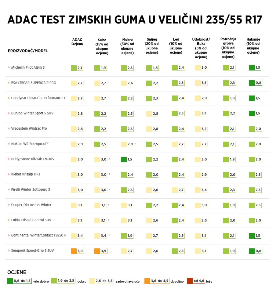 U veličini 235/55 R17 V (do 240 km/h), od 13 testiranih modela samo je jedna guma pokazala vrlo uravnotežene performanse i stoga se može ocijeniti kao “dobra”. Preporučuje se jedanaest drugih modela, ali sve imaju svoje slabosti barem u jednom glavnom kriteriju. Zbog loših rezultata na suhim cestama, jedan model dobio je ocjenu dovoljno.