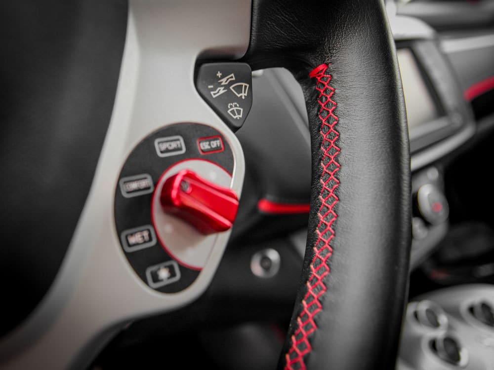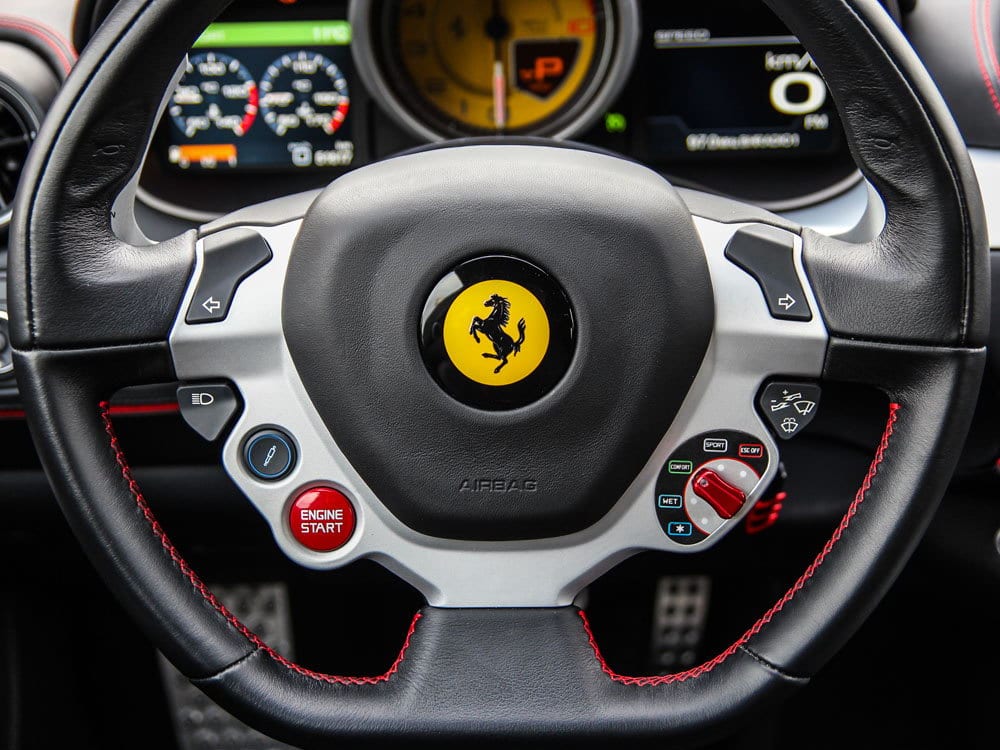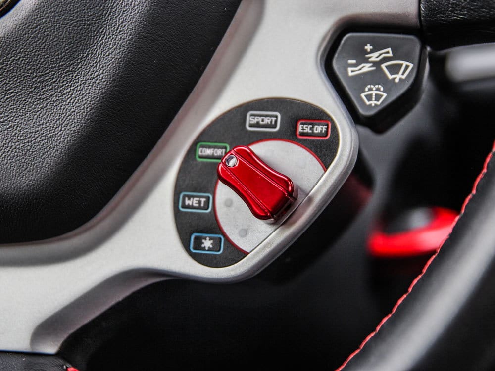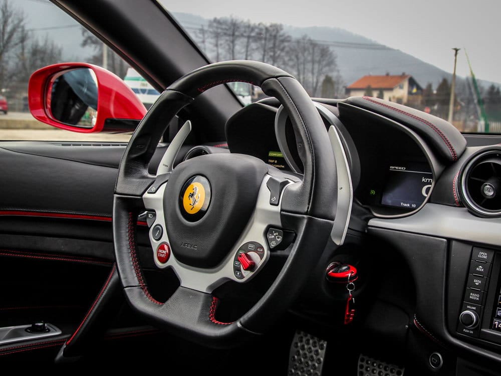 Sportska agresivnost, uz dozu luksuza, jednostavno navire iz svih elemenata. Kožni trokraki upravljač uveliko podsjeća na onaj iz F1 bolida. Na njemu su smješteni svi bitni prekidači, oni pravi: klik-klak. Start motora, podešavanje režima vožnje, tvrdoće ovjesa, sve je na dohvat ruke/prstiju, a iza samog upravljača tu su i velike aluminijumske papučice za promijene stepena prijenosa.