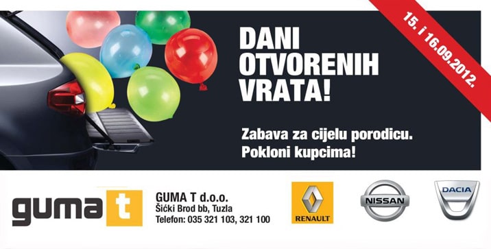 Ovlašteni koncesionar Renault, Nissan i Dacia vozila, Guma T d.o.o. Tuzla za svoje kupce i vjerne klijente, za vikend 15. i 16. septembra, u periodu od 10:00 do 18.00h širom otvara svoja vrata.