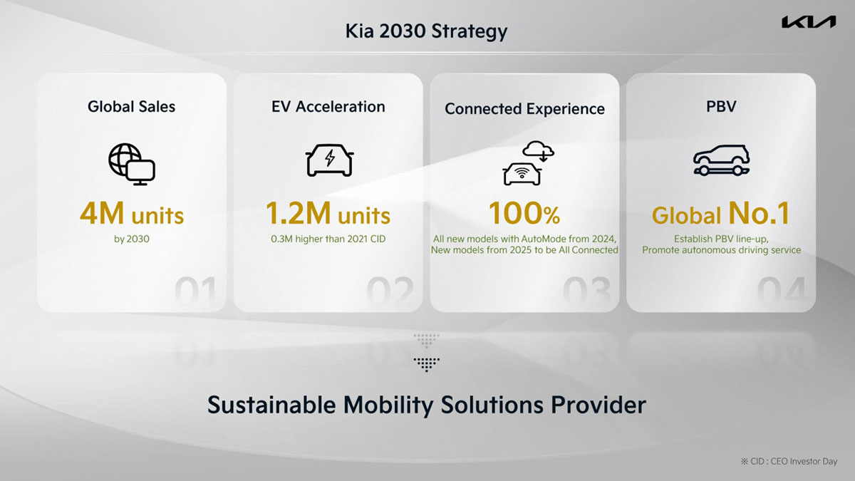 Kia je objavila i svoja četiri ključna poslovna cilja za 2030. godinu. Isti uključuju: brži tempo elektrifikacije i dostizanje godišnje prodaje od 1,2 miliona primjeraka baterijskih električnih vozila (BEV) do 2030. godine; dostići 4 miliona prodatih vozila godišnje do 2030., uključujući i više od dva miliona ekološki prihvatljivijih modela; širu upotrebu automobilskih funkcija povezivosti i tehnologije autonomne vožnje na sva nova vozila; te do 2030. godine postati brend broj jedan na svjetskom tržištu namjenskih vozila (PBV).
