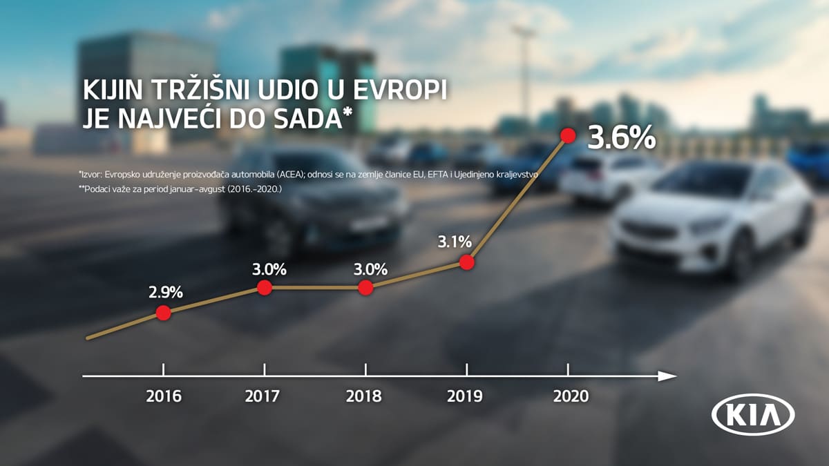Sa 259.442 prodata primjerka u Evropi od januara do avgusta, što je 23,4 % manje nego u rekordnoj 2019., Kia je pretekla neke automobilske brendove. Evropsko tržište automobila je inače u odnosu na isti period 2019. godine doživjelo pad za trećinu (-32,9 %).