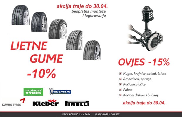 Auto kuća Pavić, ovlašteni distributer i serviser Citoren automobila, svim vlasnicima francuskog brenda nudi posebnu servisnu akciju. Tokom servisne akcije možete kupiti gume za vaš automobil s popustom od -10%. U ponudi su gume proizvođača Michelin, Pirelli, Nokian, Kleber i Kumho.