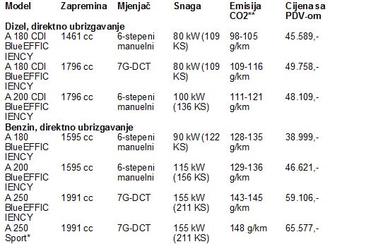 Istovremeno, novom A-klasom još jednom je potvrđeno da sigurnost u Mercedes-Benzu nije pitanje cijene – u serijsku opremu je uključen i COLLISION PREVENTION ASSIST, radarski sistem za izbjegavanje sudara. Cijene kreću od 38.999,- KM do registracije za A 180 BlueEFFICIENCY. Nova A-klasa se već može naručiti u svim ovlaštenim Mercedes-Benz prodajnim centrima u Bosni i Hercegovini.