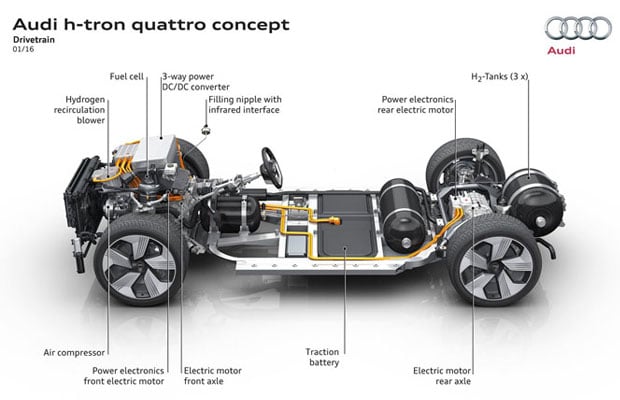 Audi h-tron quattro nagovještava kako bi mogao izgledati budući SUV model koji bi za pokretanje koristio vodonik i princip gorivnih ćelija. Ovaj model pored nulte emisije ispušnih plinova ima autonomiju više od 600 kilometara. Kada je riječ o punjenju rezervoara za vodonik, ono traje svega četiri minute.