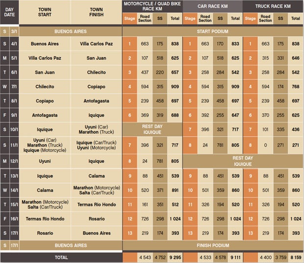 Kao i prošle godine, rute će za različita vozila biti različite, a posebno za kamione čija će ruta biti kraća za gotovo 1.000 km, kako bi se izbjeglo zagađivanje slanih ravnica u Boliviji. Svi takmičari će se okupiti krajem decembra u Buenos Aresu, odakle će startati 04. januara i gdje će se vratiti 17. januara.