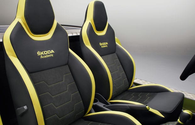 Crna kožna sjedišta sa žutim ivicama i dekorativnim šavovima na kojima je izvezeno ime Škoda Akademija, preuzeta su od modela Škoda Octavia RS. Isti koloritni dizajnerski stil primijenjen je i na ostalim unutrašnjim elementima automobila. Instrument tabla je u biserno žutoj boji, dok su volan i mjenjač obloženi crnom kožom sa zlatno-žutim detaljima. Površina između instrument table i vjetrobranskog stakla je također obložena crnom kožom.