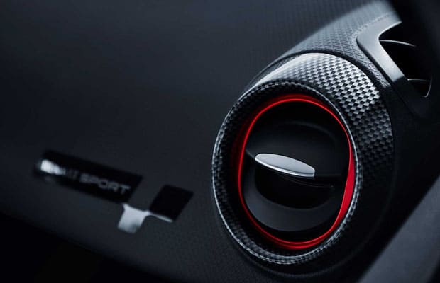 Otvaranje vrata otkriva prag sa oznakom R.S. i serijskim brojem, upravljač je presvučen kombinacijom kože i alkantare, a okviri ventilacijskih otvora od karbona doprinose sportskom dojmu unutrašnjosti.