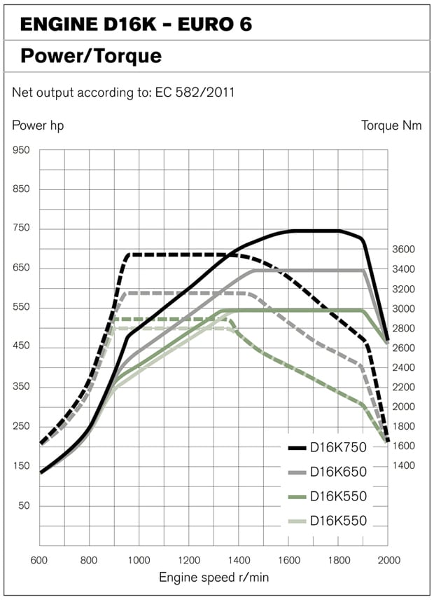 U ponudi su verzije sa motorima od 750 KS (3.550 Nm), 650 KS (3.150 Nm) i 550 KS (2.900 Nm*). 50% niža emisija čvrstih čestica (čađi) i 80% niža emisija azotnih oksida (NOx) u poređenju sa verzijom Euro 5. FH16 sa Euro 6 motorima je raspoloživ na tržištu Evrope. Verzija sa ručnim mjenjačem raspolaže sa 2.800 Nm okretnog momenta.
