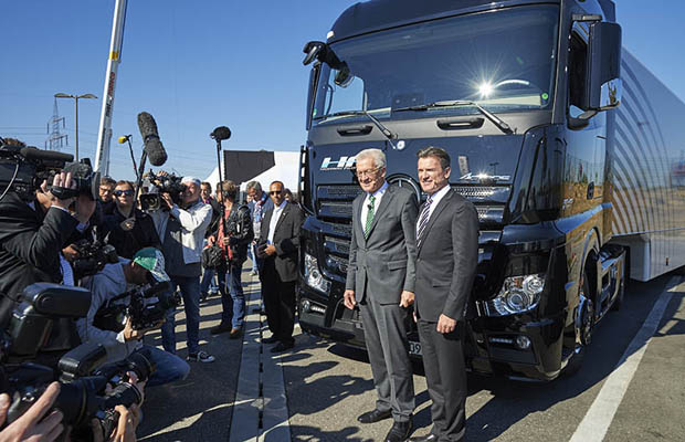 Za upravljačem tegljača Mercedes-Benz Actros bio je dr. Wolfgang Bernhard, prvi čovjek Mercedesovih kamiona i autobusa, a na suvozačevom mjestu bio je premijer Savezne države Baden-Württemberg, Winfried Kretschmann.