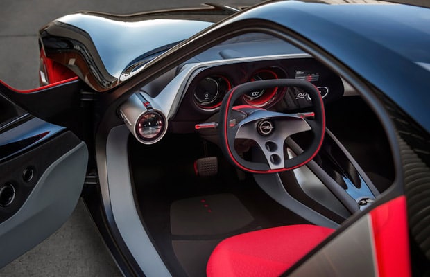 Monitori bilježe što se događa okolo vozila i zamjenjuju vanjske retrovizore. I sjajno crveni uvlakači sigurnosnih pojaseva prava su mala remek-djela i prate dizajn crvenih prednjih kotača. Upravljač sa svojim krakovima oponaša legendarni Opel GT iz šezdesetih i sedamdesetih godina.