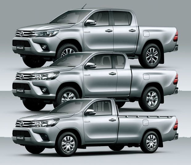 U ponudi će biti tri karoserijska oblika, odnosno oblika kabine, Double Cab, Extra Cab i Single Cab. Novi HILUX nadmašuje svog prethodnika i po dimenzijama, dužinom od 5.335, širinom od 1.855 i visinom od 1.820 mm (Double Cab). Na taj način, ne samo da putnici imaju više prostora i veći tovarni prostor, već je povećan i prostor oko motora, čime je olakšano i ubrzano servisiranje i održavanje.