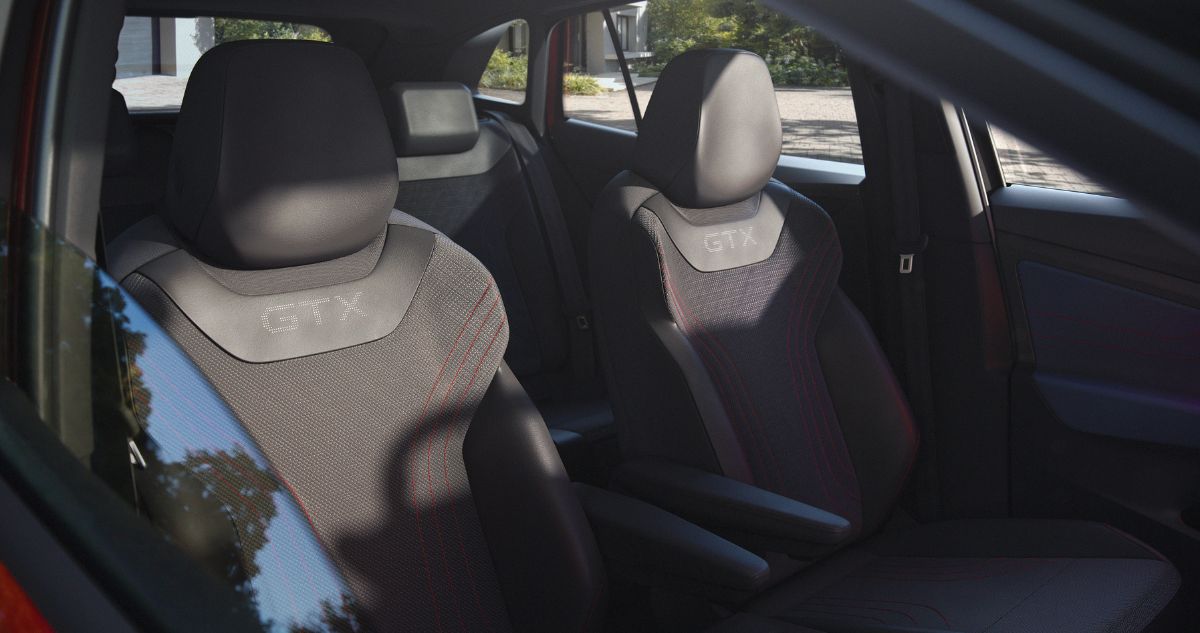 Crveni kontrastni šavovi – klasični simbol za sportski izgled i snagu – dodaju akcente sjedištima. Logo GTX pojavljuje se na upravljaču, oblogama panela pragova i – u perforiranom obliku – na vrhu naslona prednjih sjedišta.