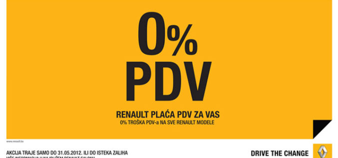 Nova Renault akcija – 0% pdv Renault je za svoje kupce u Bosni i Hercegovini ponovo pripremio, sada već tradicionalnu, prodajnu akciju pod nazivom “Renault plaća PDV za Vas” u