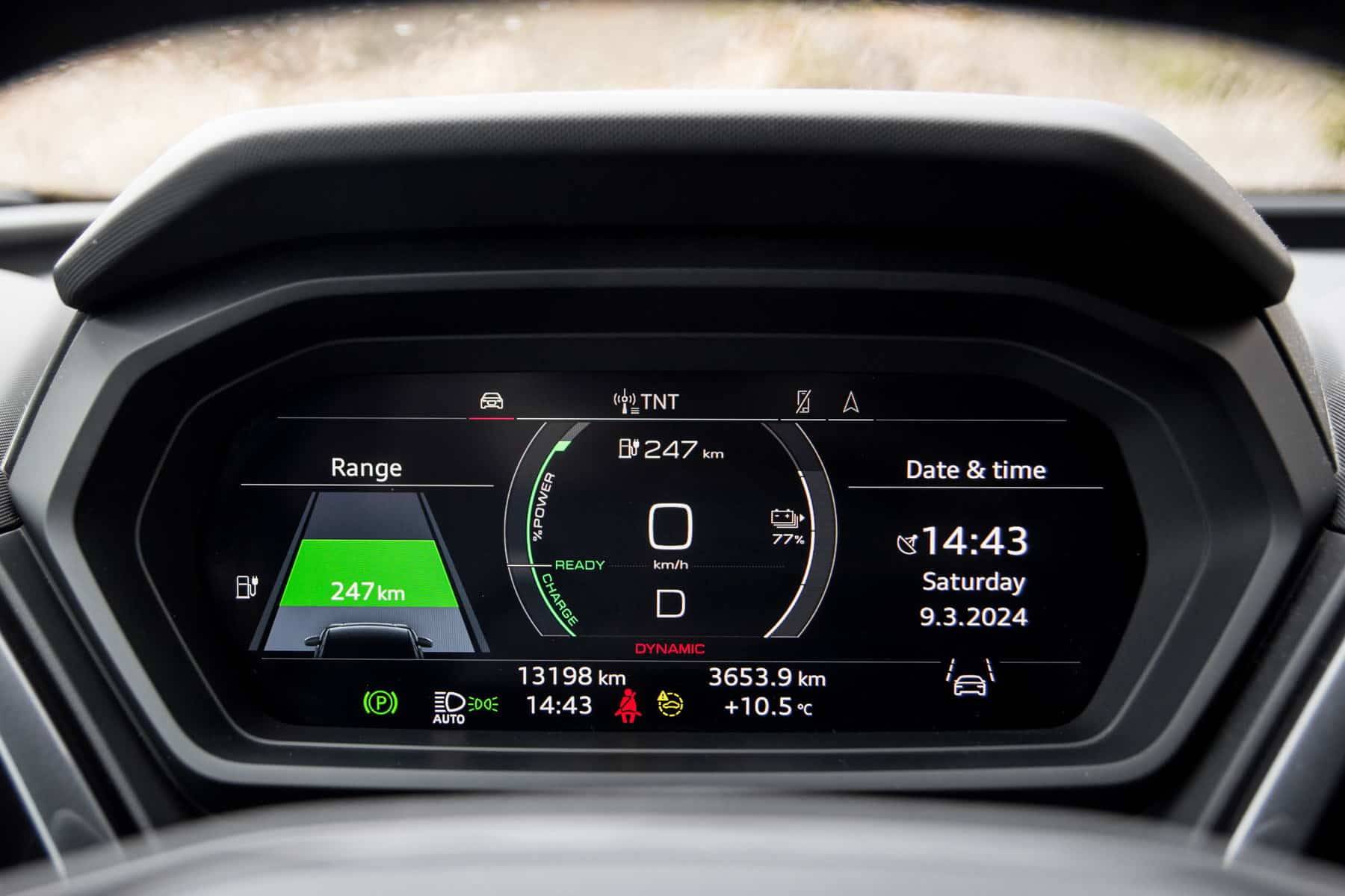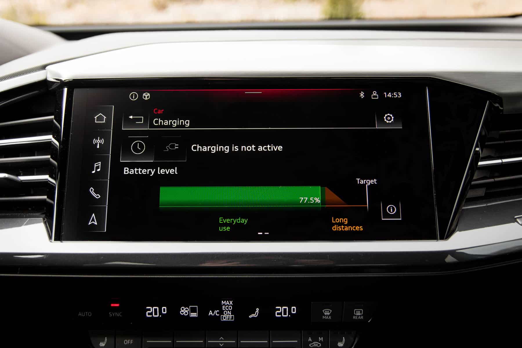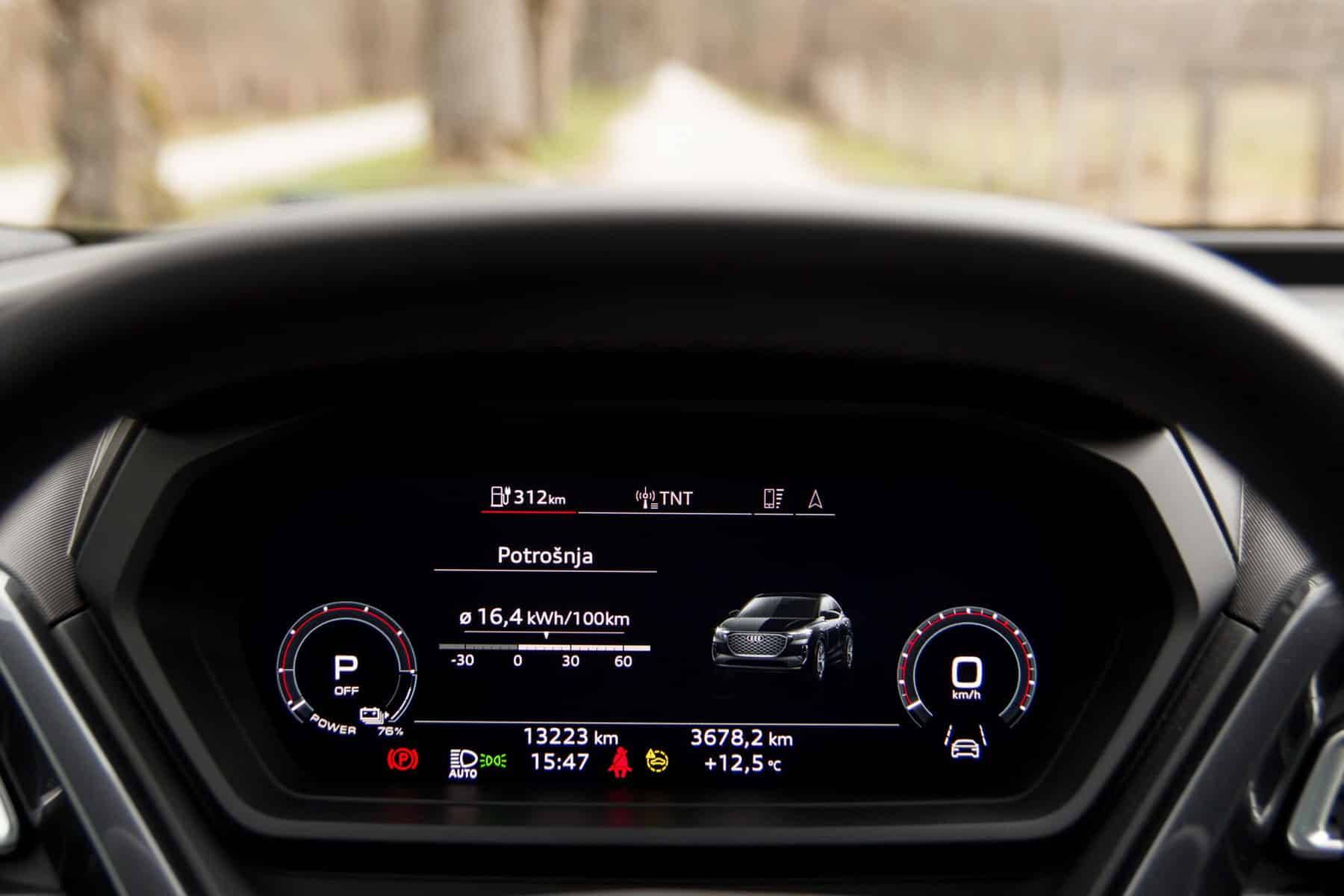 Kako bi se produžio životni vijek baterije napravljen je sistem kojim se ograničava punjenje maksimalno do 80%. Audi je specificirao da sa jednim punjenjem baterije možete prijeći čak do 497 kilometara. Ti rezultati dobiveni su po WLTP mjerenju u optimalnim uslovima, međutim većina vozača neće voziti u idealnim uslovima pa je ta kilometraža nešto manja, a tokom testa jedan od fokusa bio je i realni domet.