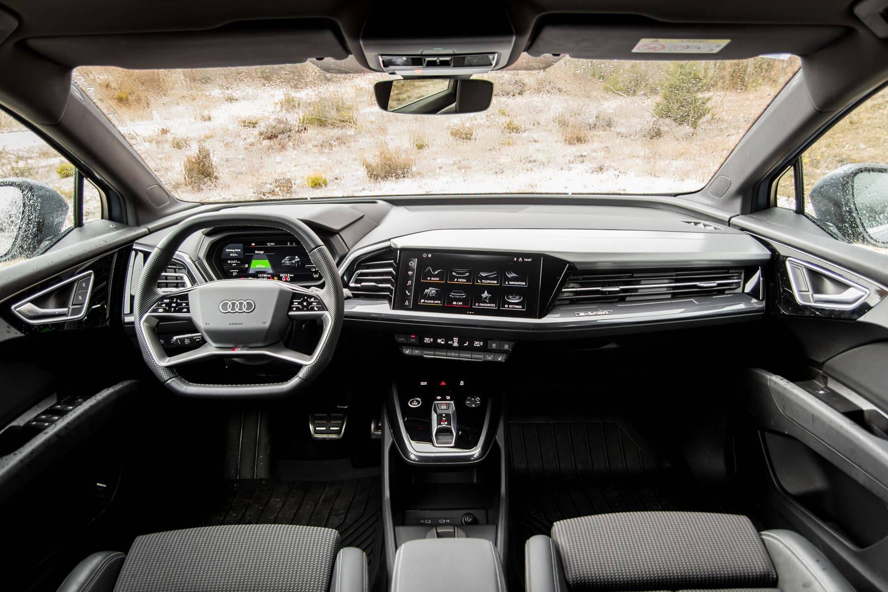 Unutrašnjost modela Audi Q4 Sportback e-tron vrlo je moderna i dovoljno prostrana za putovanje pet odraslih putnika. Dizajneri su bez velikih eksperimenata napravili fantastičan spoj tradicionalnih konceptnih rješenja i modernih tehnologija što ovaj automobil čini gotovo pa idealnim za svakodnevnu upotrebu, a pri tome je dizajnerski dopadljiv i tehnološki sofisticiran. Instrumentna ploča usmjerena je prema vozaču i podijeljena je na zasebna područja.