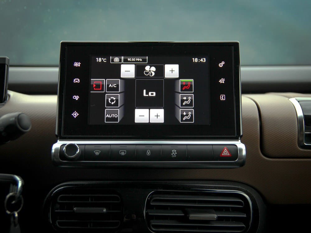 U sredini centralne konzole nalazi se 7 inčni ekran osjetljiv na dodir putem kojeg se upravlja sa ventilacijom, audio uređajem, telefonom i sl. Svi prekidači su uklonjeni sa centralne konzole i komande se izvršavaju isključivo putem ekrana osjetljivim na dodir. Nema šta, zaista tehnološki odlično izvedeno, ali ne i praktično. Zašto? Pa da bi recimo upravljali ventilacijom, morate tipkati po ekranu, a to će vam svakako skretati pažnju tokom vožnje, što i nije baš poželjno u gradskoj vožnji. To nije „problem“ samo kod ovog automobila, već kod svih koji su primjenili isti sistem. Kada je riječ o jačini kontrasta ekrana, tu nema problema, sve se jasno vidi i po najvećem suncu kada je refleksija izrazito jaka.