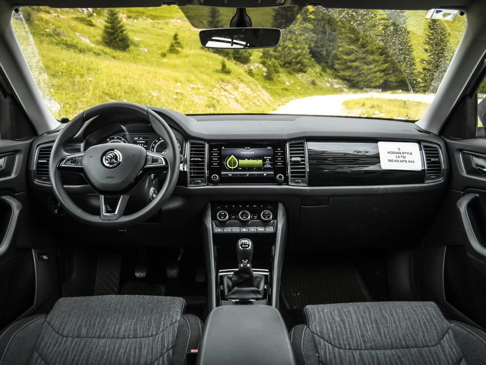 Jedna od najvećih vrijednosti unutrašnjosti Kodiaqa je odlična ergonomija koja omogućava intuitivno rukovanje. Za izradu unutrašnjosti korištena je kombinacija nekoliko materijala, a najbolja finalna obrada ostavlja utisak elegancije. Prtljažnik Kodiaqa u velikoj mjeri odskače od konkurencije jer nudi osnovnu zapreminu od 270 / 720 / 2065 litara, ovisno konfiguraciji i položaju zadnjih sjedala.