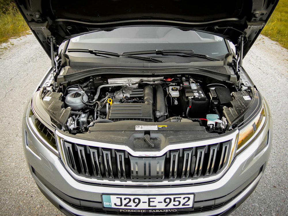 Za pokretanje testnog modela bio je zadužen 1.4 litreni TSI benzinski motor sa 150 KS i 250 Nm okretnog momenta. Motor je bio uparen sa ručnim šest stepenim mjenjačem kojeg krasi odlična preciznost. Snaga do podloge prenosi preko sva četiri točka putem sistema 4×4. Uz ukupnu težinu od 1653 kg Kodiaq pokretan sa ovom kombinacijom motora, mjenjača i pogona ima sasvim solidne performanse pa tako od 0 do 100 km/h stiže za 9,9 sekundi i postiže maksimalnu brzinu od 196 km/h.