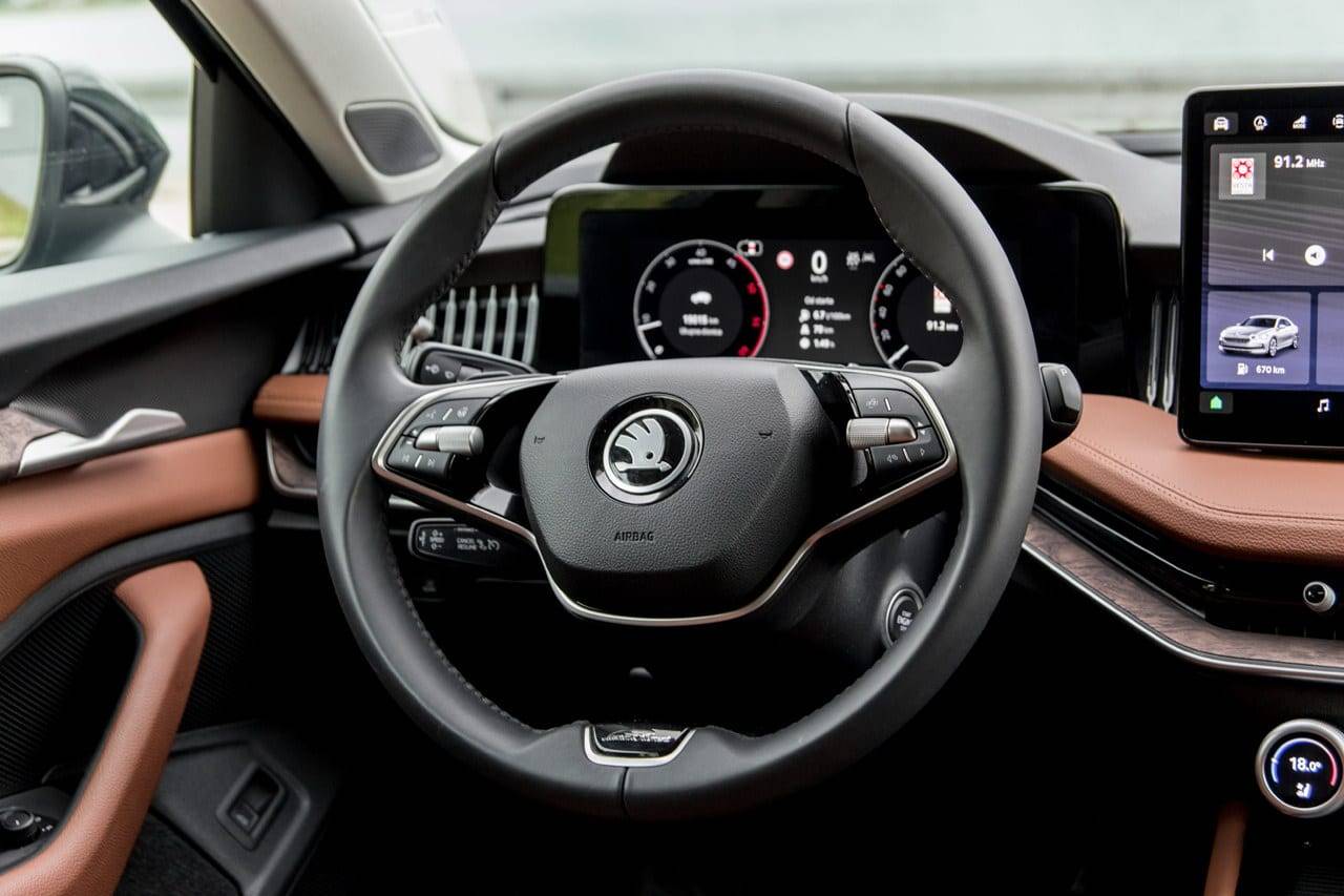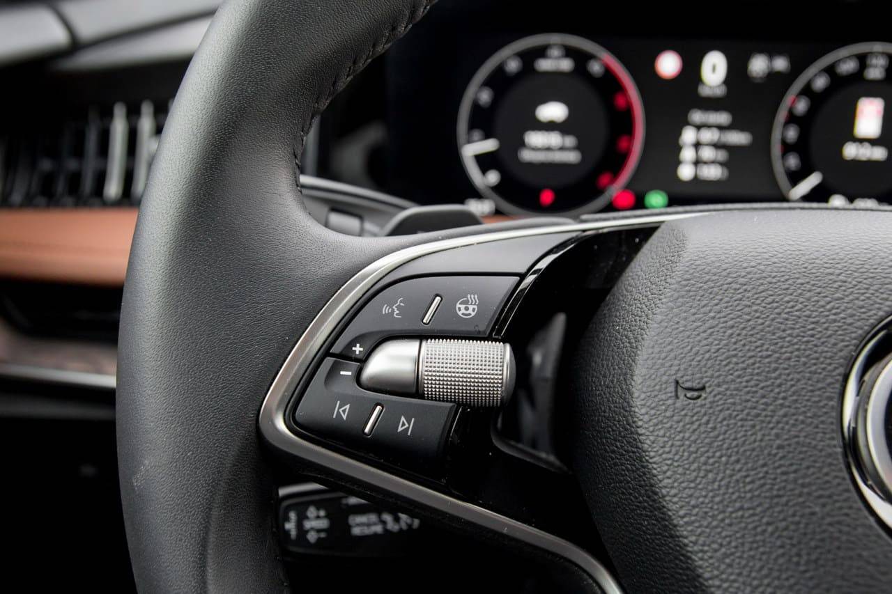 Komande s desne strane volana, poput brisača i podešavanja tempomata, sada su integrisane u lijevu ručicu. Škoda je uvela još jedno novo tehnološko rješenje koje dodatno olakšava interakciju sa vozilom. To je Škoda Smart Dials – rotirajuće multifunkcionalne kontrole sa mini ekranima, kojim se prvenstveno upravlja klimom, grijanjem, masiranjem sjedišta ali i drugim infotainment funkcijama.