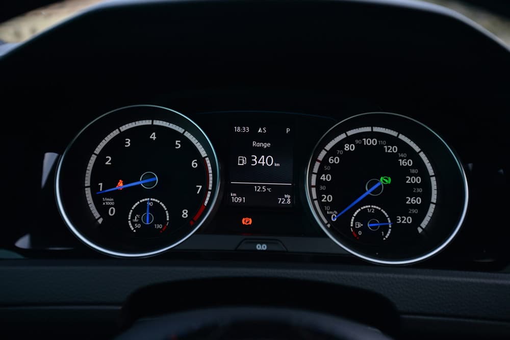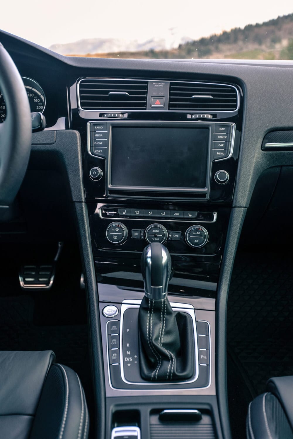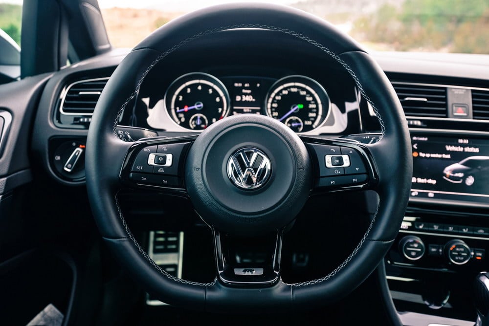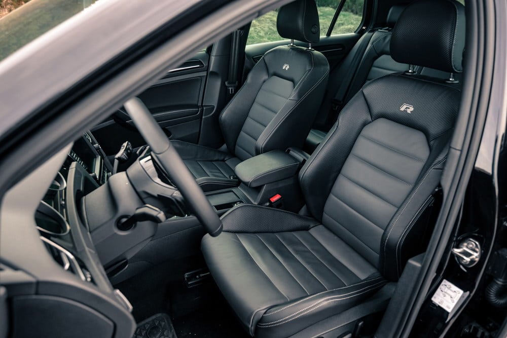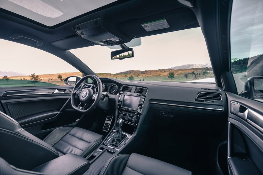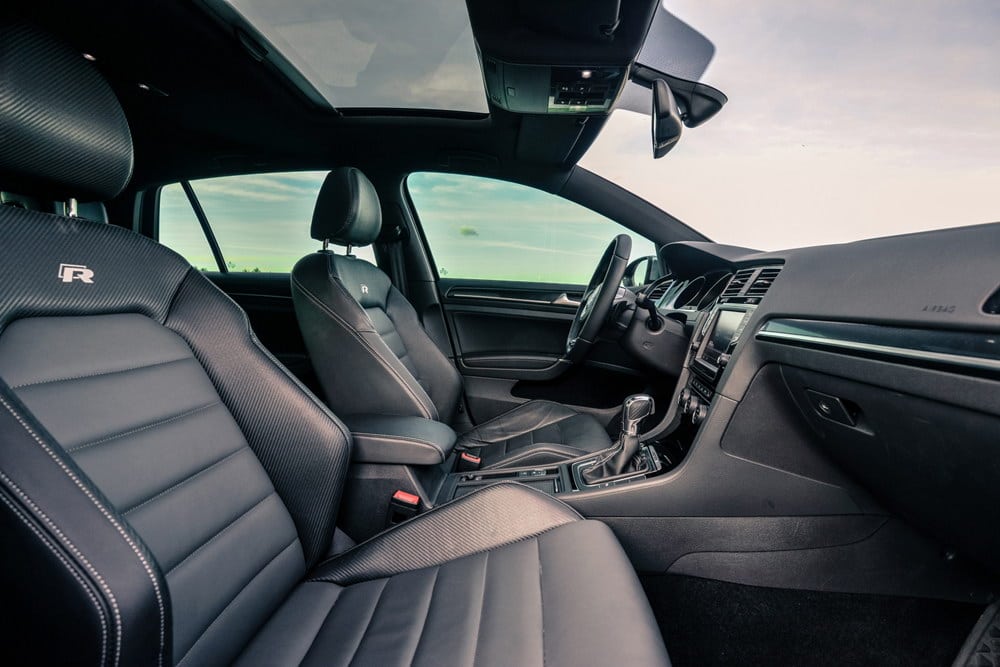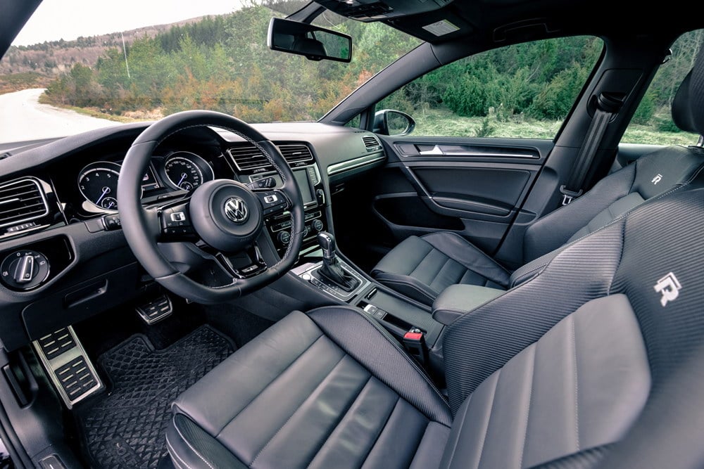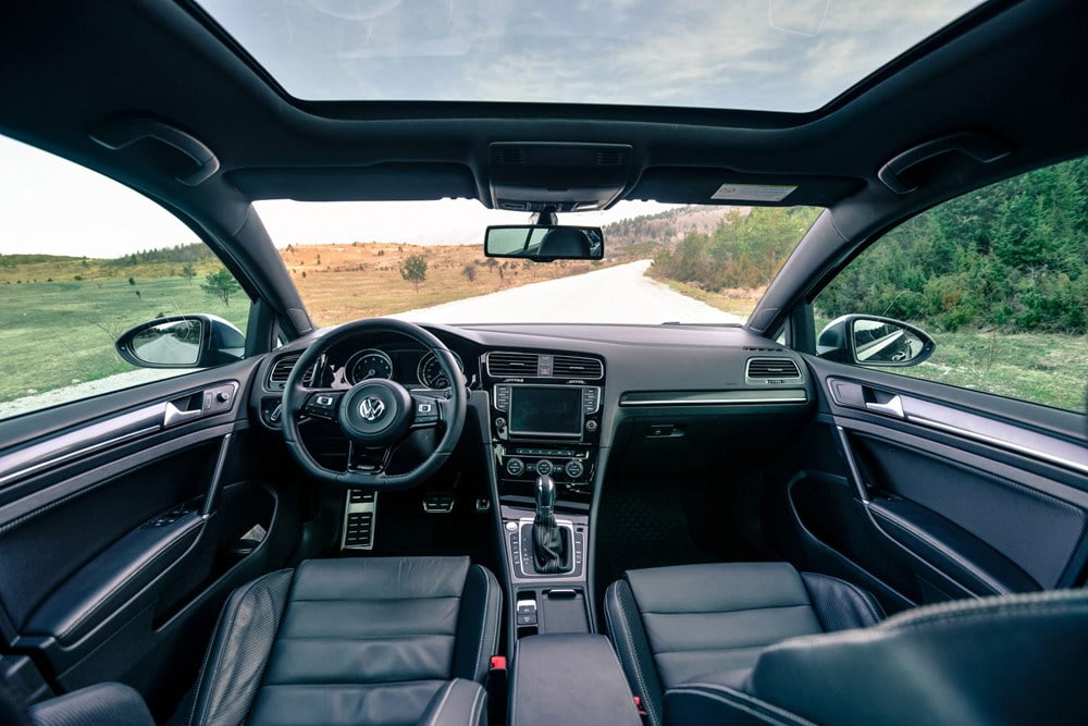 Unutrašnjost testiranog Golfa R odisala je sportskim duhom, kako mu i dolikuje. Potpuno crni enterijer, duboko profilisana kožna sjedišta sa kombinacijom karbon-kožnh umetaka, ambijentalno osvijetljenje u plavoj i bijeloj boji, audio/telefon/navigacioni sistem sa velikim 8 inčnim ekranom osjetljivim na dodir, panorama krov… itd, samo su neki od detalja kojim je opremljen testirani model, što u konačnici ostavlja fantastičan utisak. Kvalitet korištenih materijala bolja je od prosjeka za klasu, sve je precizno spojeno i čvrsto kao stijena. To tako mora biti, jer za kofer novca koliko košta Golf R, kupac želi najbolje!