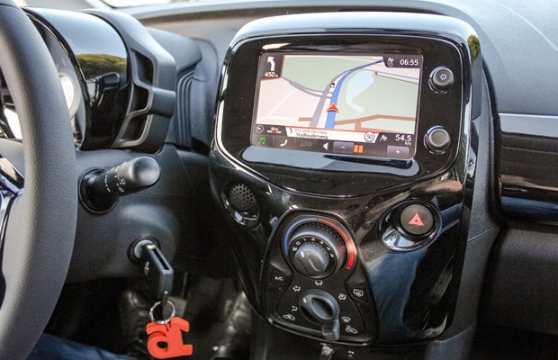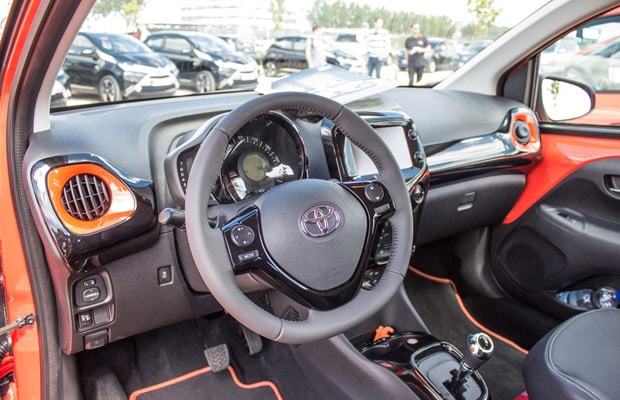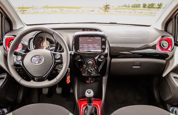 Dizajn unutrašnjosti novog Aygoa temeljito je promjenjena, pa je sada daleko ljepša, zabavnija i modernija. Iako je izrađena od tvrde plastike, finalna obrada odlična a svi sastavi su japanski precizno uklopljeni. Ono što definitivno uljepšava unutrašnji ambijent novog Aygoa jesu obojeni pastični umetci, a ništa manje važu ulogu nema ni 7 inčni ekran osjetljiv na dodir pod nazivom X-Touch. Očekivano, on prikazuje sve informacije od audio uređaja, navigacije, Google servisa, kao i informacije sa mobilnog telefona kada je uparen sa ovim sistemom. No, pored navedenog isti ekran prikazuje i sliku sa kamere za vožnju unatrag koja je standardni dio opreme Aygoa druge generacije.