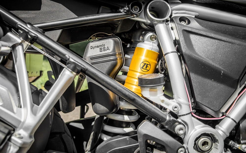 Testirani model opremljen je sa elektronskom suspenzijom Dynamic ESA “Next Generation” s potpuno automatskom kompenzacijom opterećenja. Dynamic ESA omogućava podešavanje visine i tvrdoće ovjesa, ovisno da li ste sami na motociklu, sa prtljagom ili sa suvozačom. Visinu sjedišta možete regulisati i mehanički na samom njegovom kačenju pa tako dodatno možete sjedište podići ili spustiti.