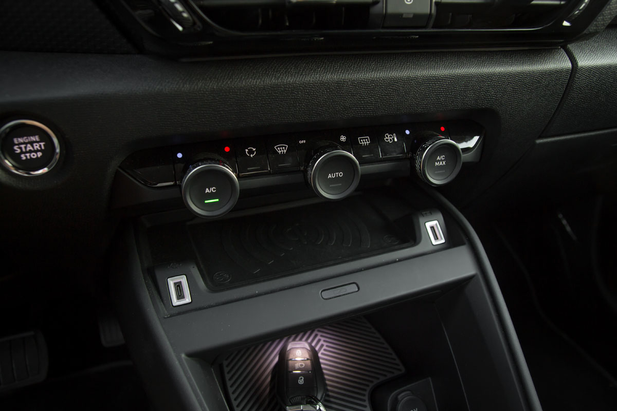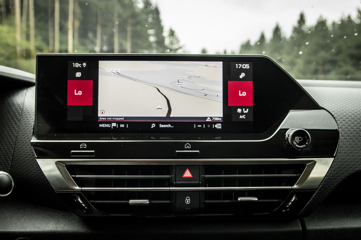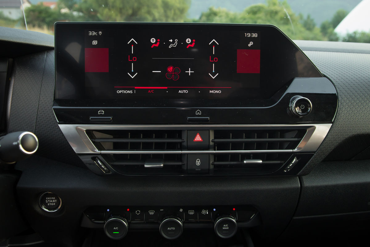 Ispod centralnih otvora za ventilaciju svoje mjesto pronašle su fizičke kontrole za upravljanje dvozonskom klimatizacijom što je definitivno pravi potez Citroënovih inženjera. No, ono djelomično radi u kombinaciji s digitalnim komandama, ali one fundamentalne kontrole: brzina ventilatora, paljenje klime, podešavanje temperature, itd, izvršavaju se preko fizičkih tastera. Ponovo jednostavno i intuitivno – palac gore za ovo rješenje.