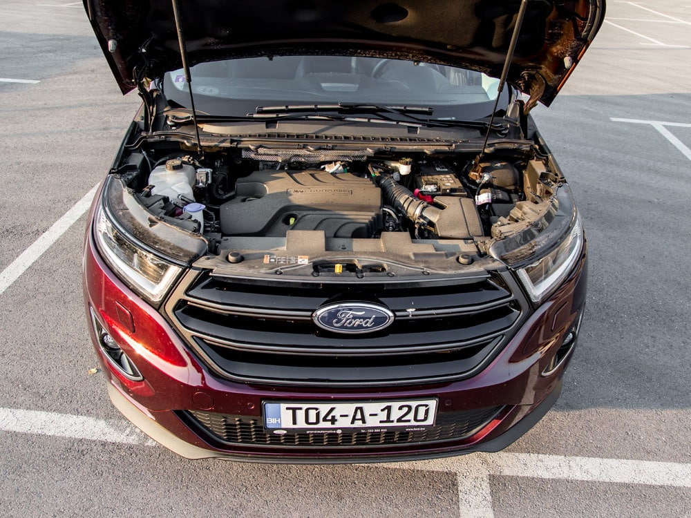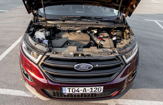 Kada je riječ o motoru, u testnom modelu bio je 2.0 litreni biturbo dizel TDCi motor sa 210 KS koji je bio uparen sa šestostepenim automatskim Powershift mjenjačem. Zahvaljujući okretnom momentu od 450 Nm koji je dostupan već od niskih 2.000 okr/min, na samom kretanju osjetimo snagu ovog motora. Ovaj motor sa dva turbo punjača iznenađuje dobrim performansama, jer s njim Ford Edge na cesti neće biti inferioran ni u postavljanju većih brzinskih špiceva.