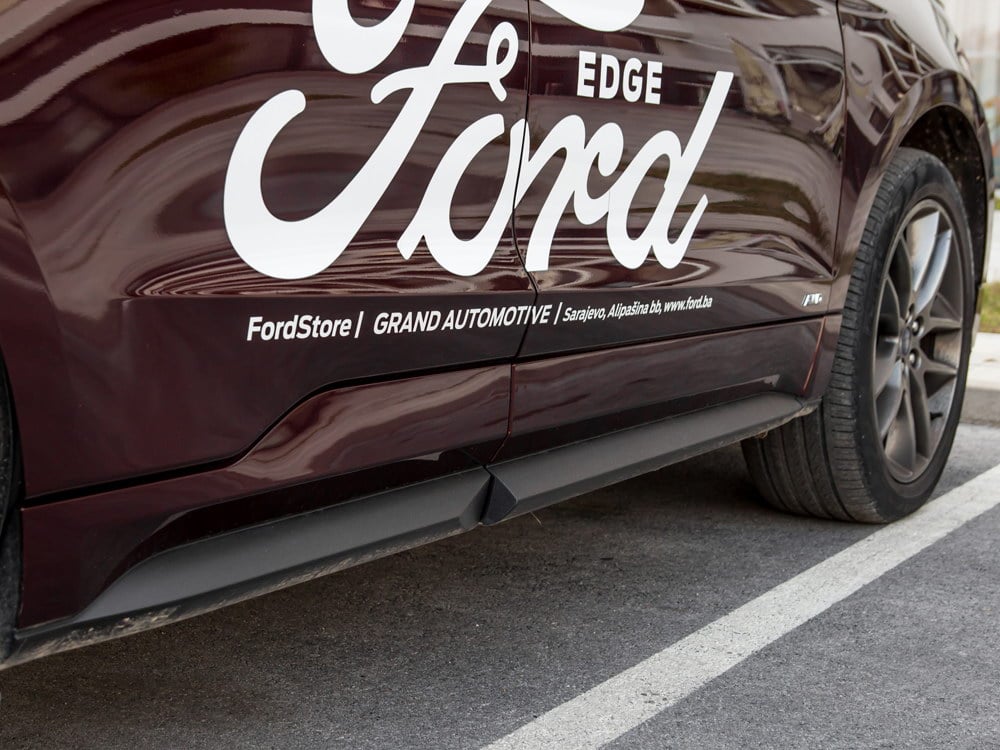 Sa dužinom od 4.808 mm, širinom 1.928 mm, visinom od 1.692 mm, te sa među osovinskim razmakom od 2.849 jasno je zašto prvo ostavlja utisak velikog automobila. Prednjim dijelom dominira velika maska na koju se odmah naslanja moderna svjetlosna grupa. Očekivano, tu su LED dnevna svjetla koja gotovo u potpunosti iscrtavaju oblik farova. Kada je Edge opremljen sa Titanium paketom opreme, maska je metalizirana, odnosno, kao u našem slučaju od crne mat plastike.