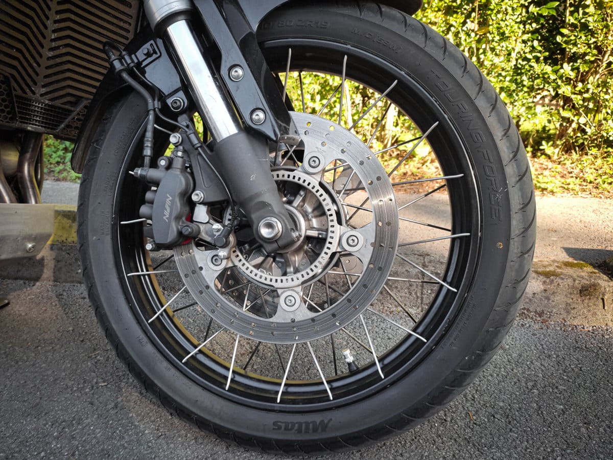 Izbor guma za svakog motociklistu veoma je važan iz nekoliko razloga: sigurnost na prvom mjestu, a onda performanse guma i sama njihova trajnost. Ponuda na evropskom tržištu je zaista široka, ali nekako se uvijek u prvi plan guraju Metzeler, Pirelli, Continental, Dunlop i Michelin. Sva četiri brenda prave zaista vrhunske gume, a razlike između njih unutar iste klase guma prilično su male. Uz to gume od navedenih proizvođača na bh. tržištu iz godine u godinu sve su skuplje, rekli bi smo da su postale i bezobrazno skupe. Međutim na ovom malom ali i rastućem tržištu može se u dosta prodavnica kupiti Mitas koji obećava mnogo toga za prihvatljivu cijenu. Zbog toga smo odabrali gume Mitas Touring Force u veličini 110/80-R19 naprijed i 150/70-R17 nazad za putni motocikl koji bez kofera sa svim tekućinama teži 306 kg.